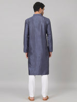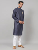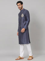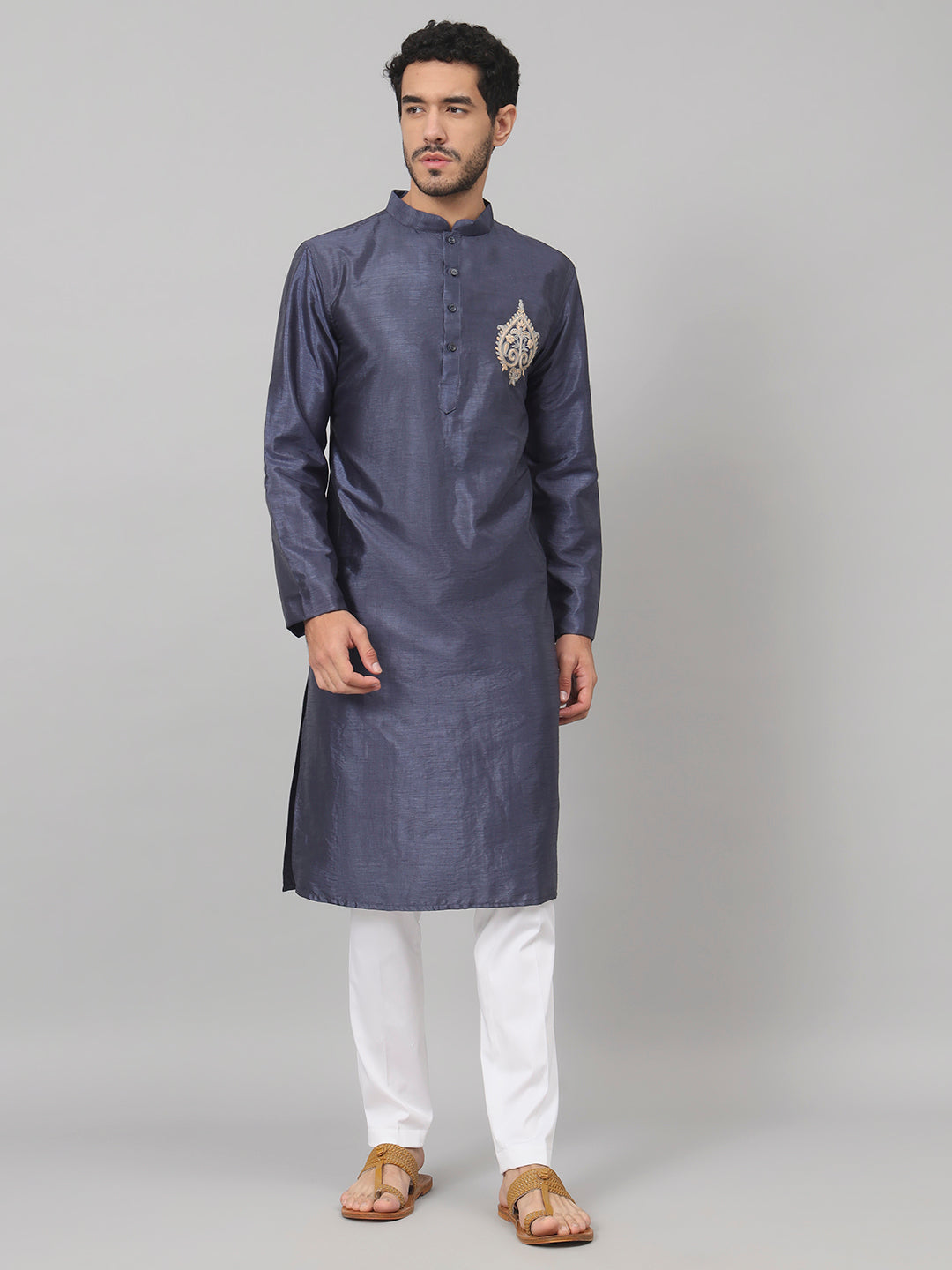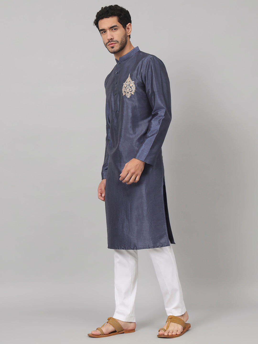 Classic Silk Kurta With Motif Embroidery by Hilo DesignPresenting our Blue Kurta accentuated with Embroidered Buta on the chest, a masterpiece of r...