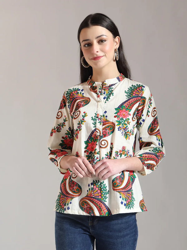 Cream Pure Cotton Paisley Peplum Top Detailing