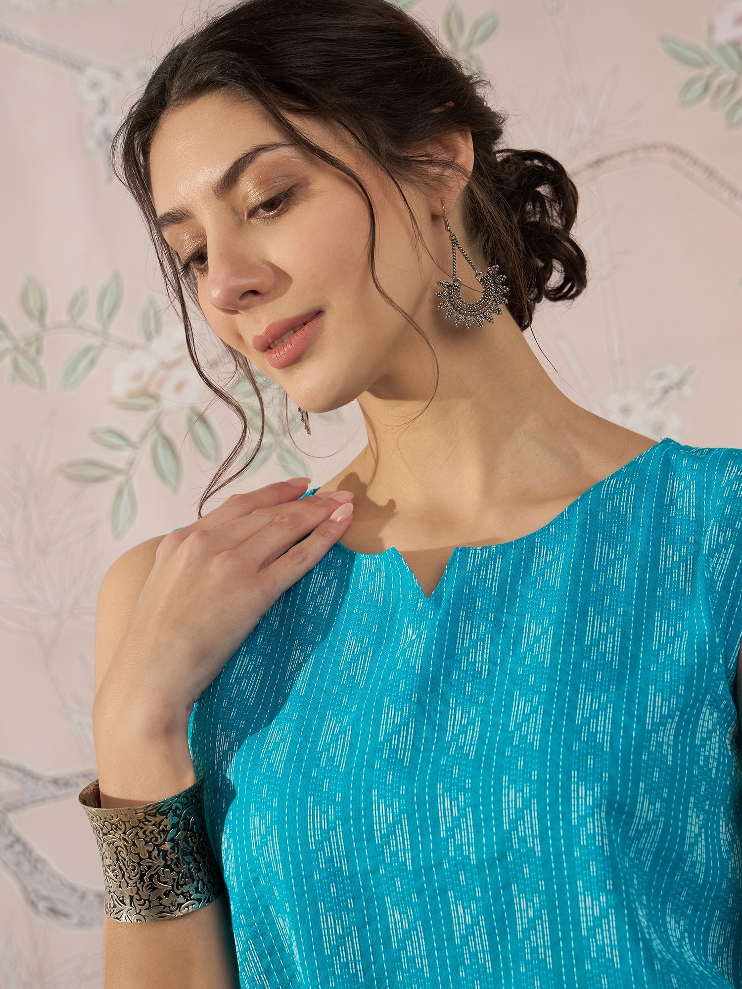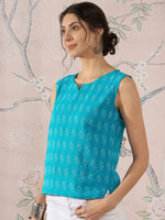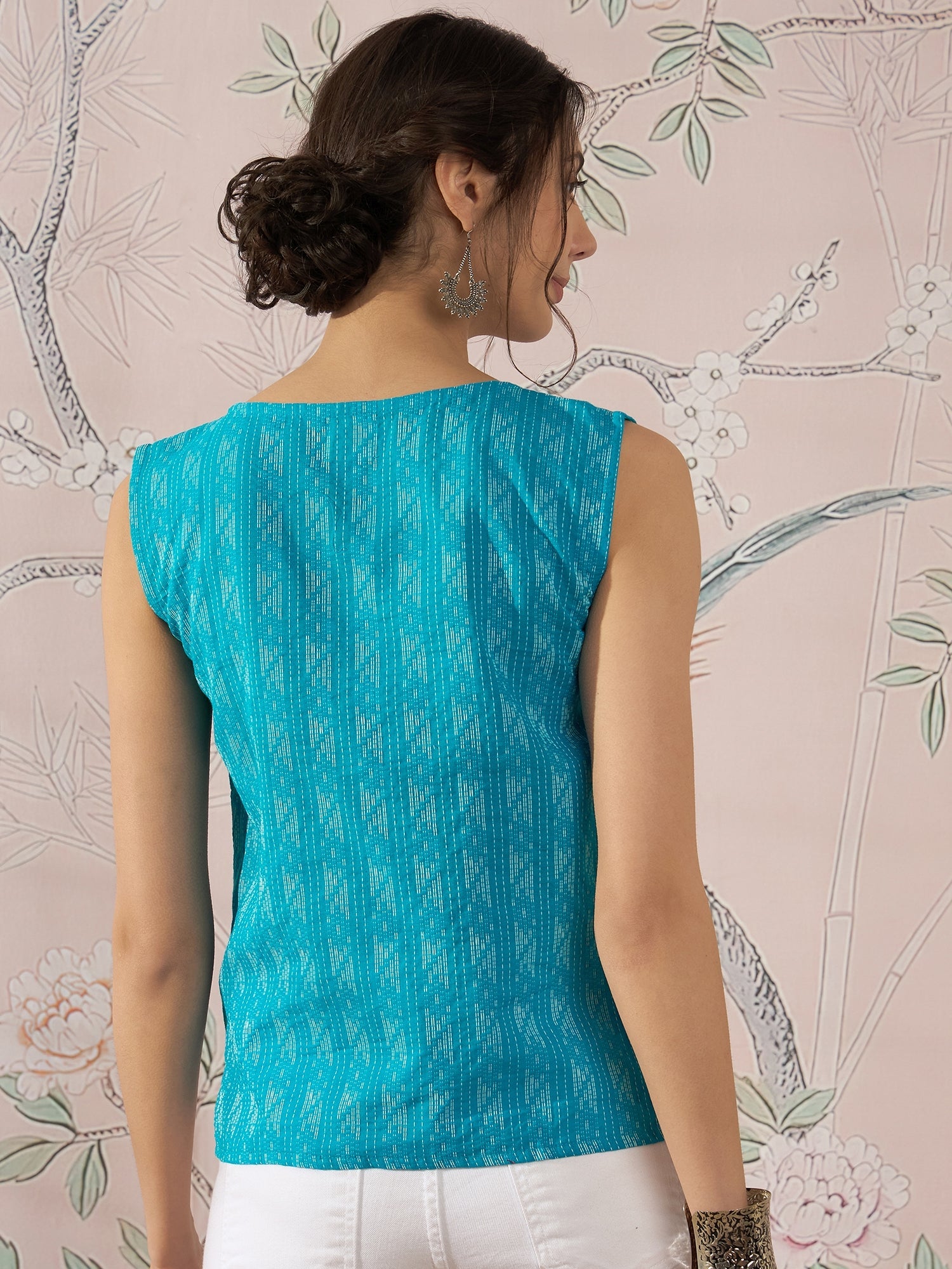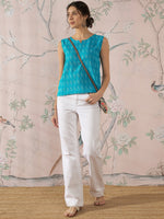 A bright cyan blue top with a combination of Ikkat weaving and Kantha embroidery, perfect for a fresh, lively style.