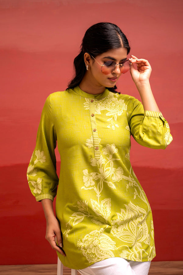 This lime floral printed viscose tunic features a mandarin collar, 3/4 cuff sleeves, side slits, and button detailing. Designed with a straight silhouette and regular fit, it’s perfect for casual, comfortable wear.