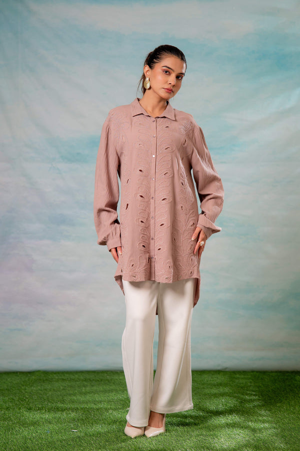 This Pink shirt in a soft viscose-linen blend features elegant zari embroidery, a shirt collar, full cuff sleeves, and a curved hem with a front slit. The straight fit and above-knee length make it perfect for casual yet polished styling.