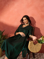The Pine Green Lurex Flared V Neck Kurta Palazzo Set is an elegant and sophisticated ensemble that combines a rich pine green color with the subtle shimmer of lurex for a touch of glamour. Here's a detailed description and styling guide for this outfit: