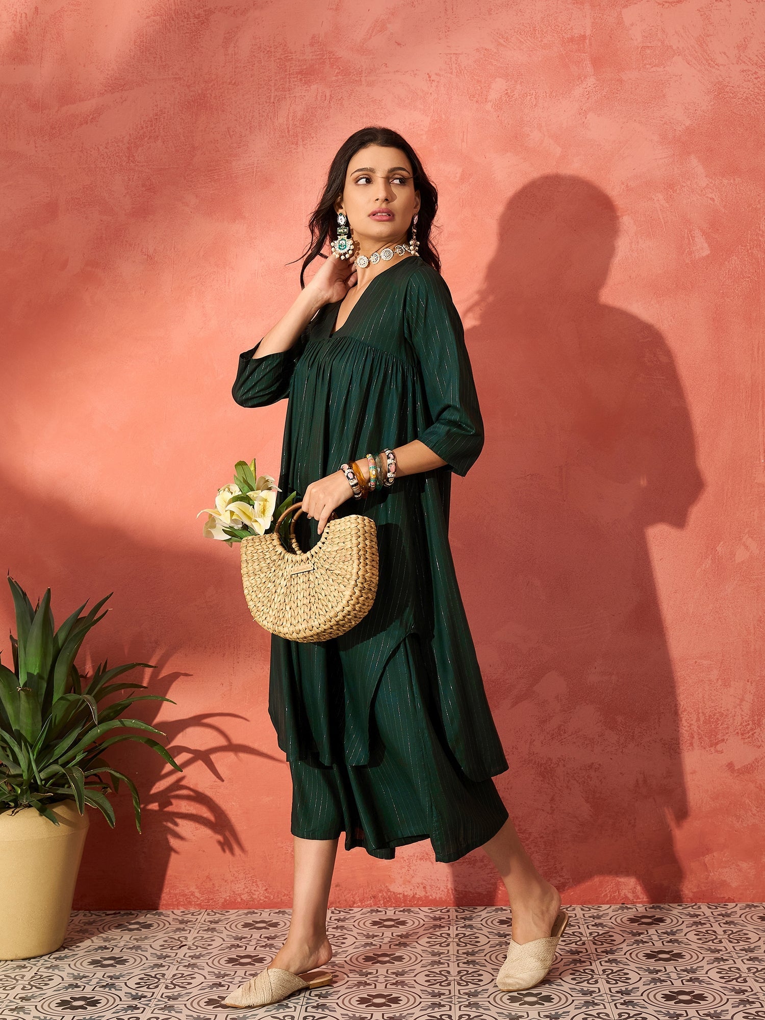 InWeave Pine Green Lurex Flared V Neck Kurta Palazzo Set - Distacart