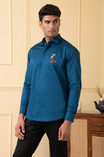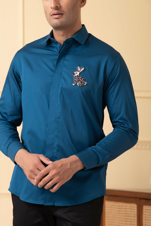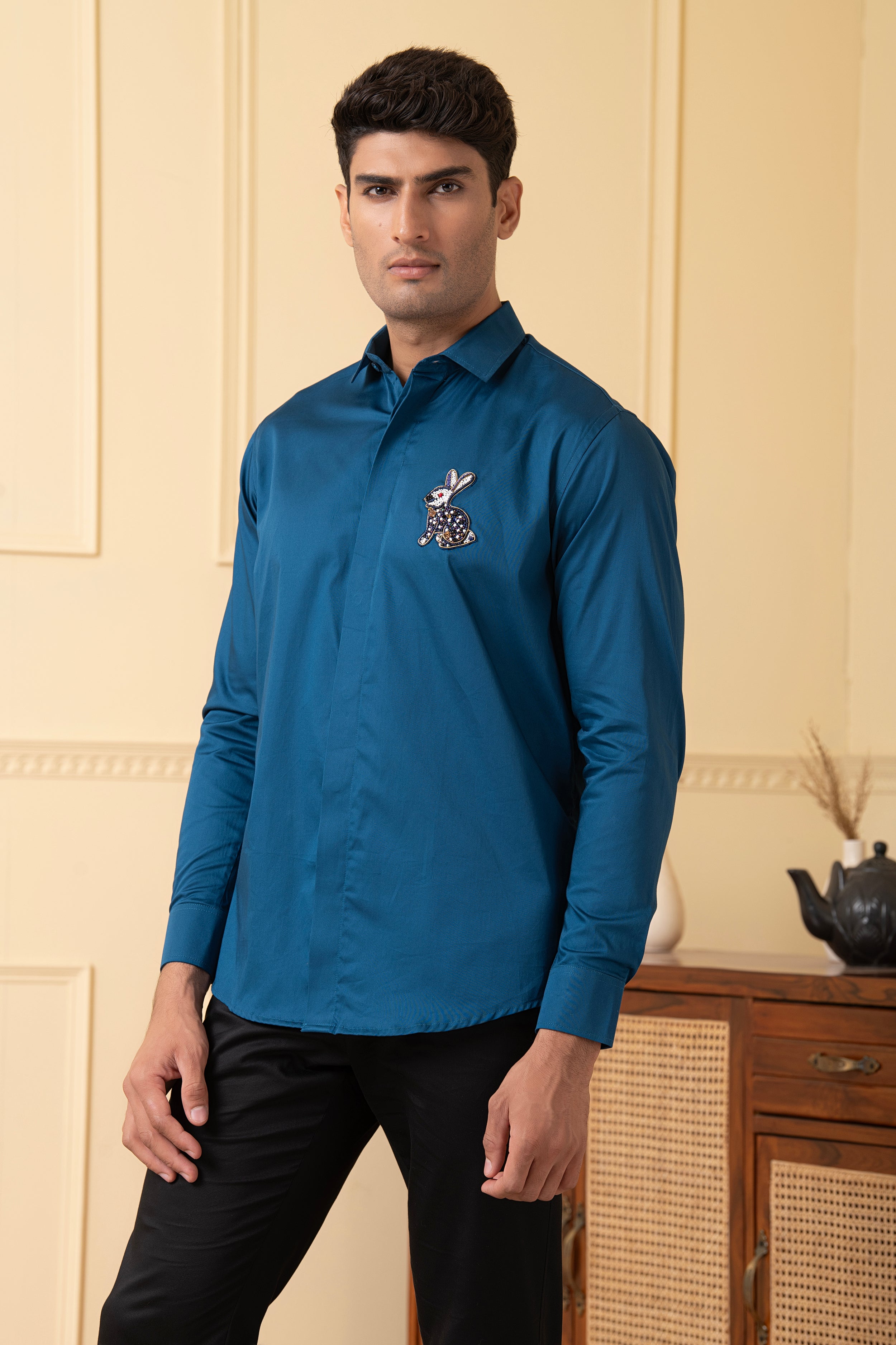 This shirt showcases intricate rabbit hand embroidery, a harmonious blend of iris blue seed beads, white, and gold accents. The artistry comes to life with meticulous detailing and a combination of textures. The concealed buttons provide a clean and elegant finish.