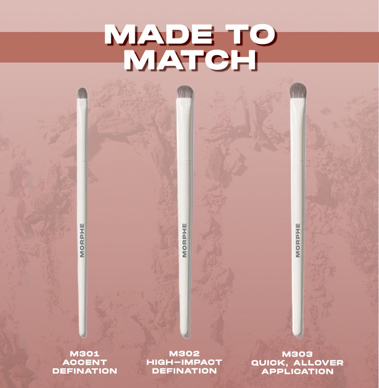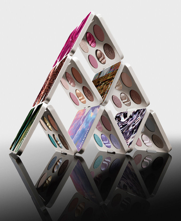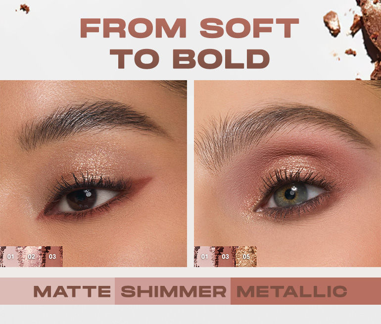 • Layer different shade finishes to create depth; blend mattes to build your base, press shimmers onto the centers of your lids or inner eye corners for brightness, and top with metallics for a high-impact finish.