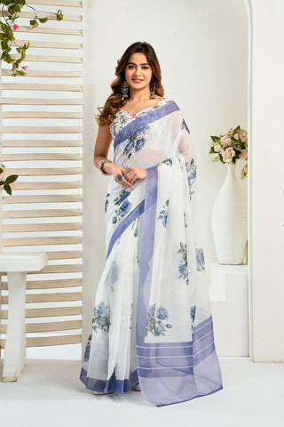 Vastranavya Blue Digital Printed Linen Ready To Wear Designer Saree with Unstitched Blouse