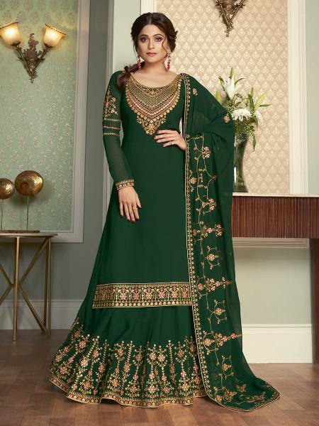Green and Gold Georgette Embroidered Gharara Suit features a Real Georgette kameez, Real Georgette bottom with Dull Santoon Inner. embroidery is completed with Zari, Dori, and Stone. this Style is made in India and checked by hand to ensure high quality.