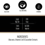 • Aloe Vera Gel, Distilled Water, Cucumber Extracts, Vitamin E oil, Natural preservatives.