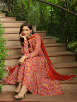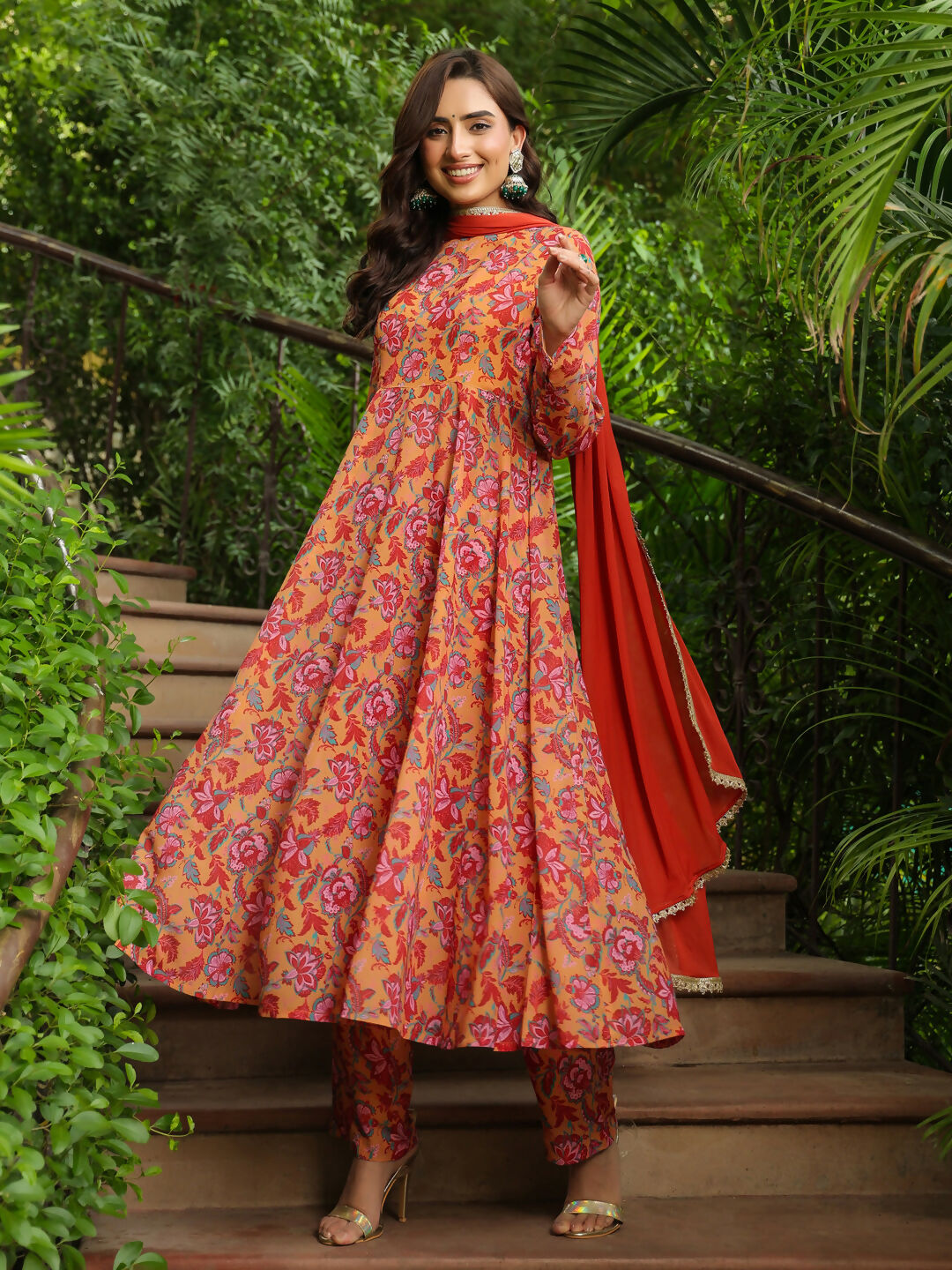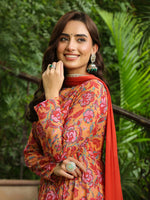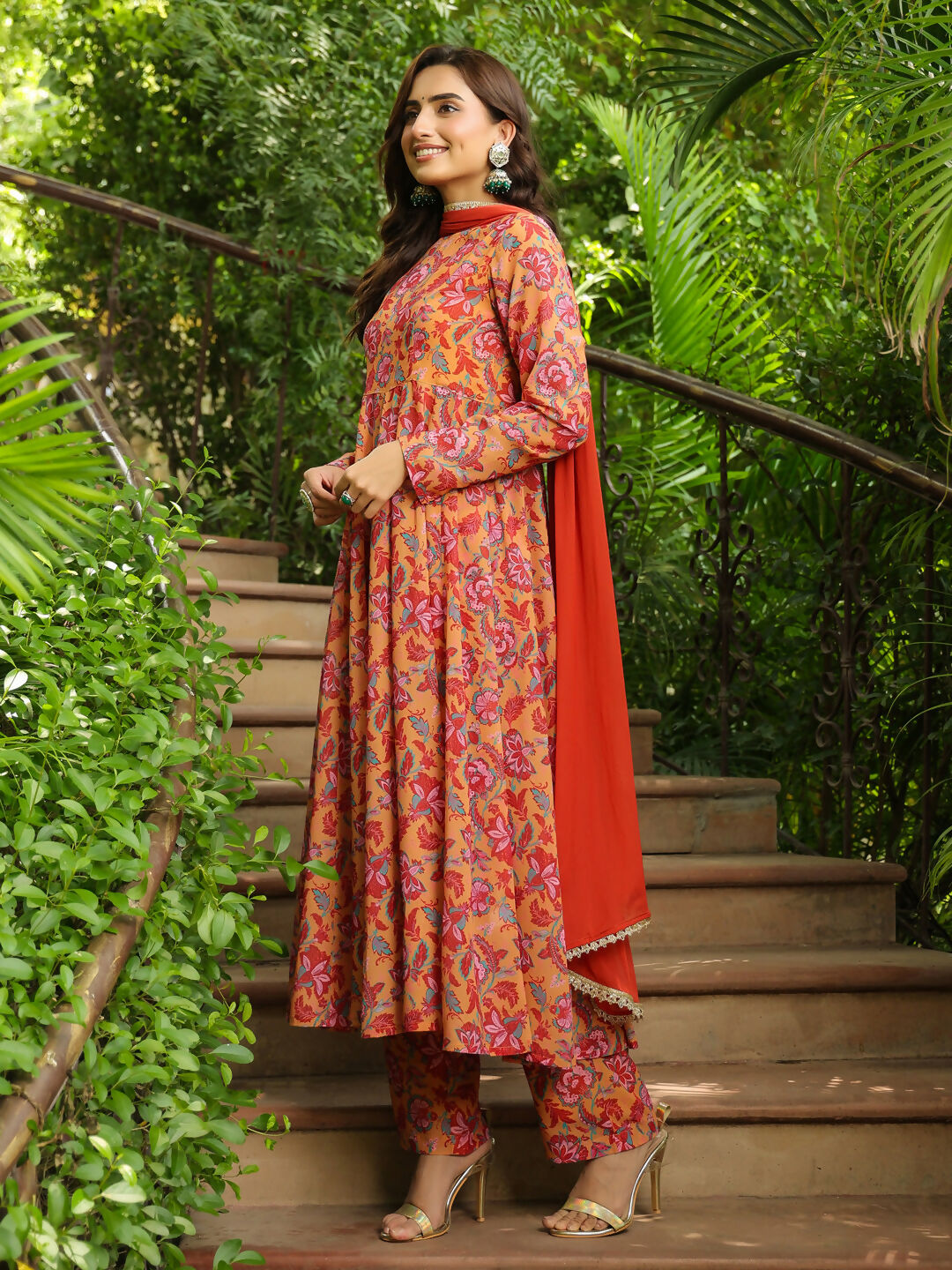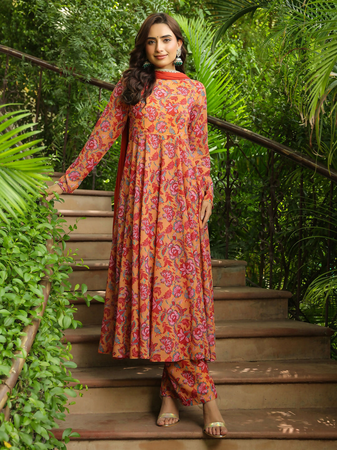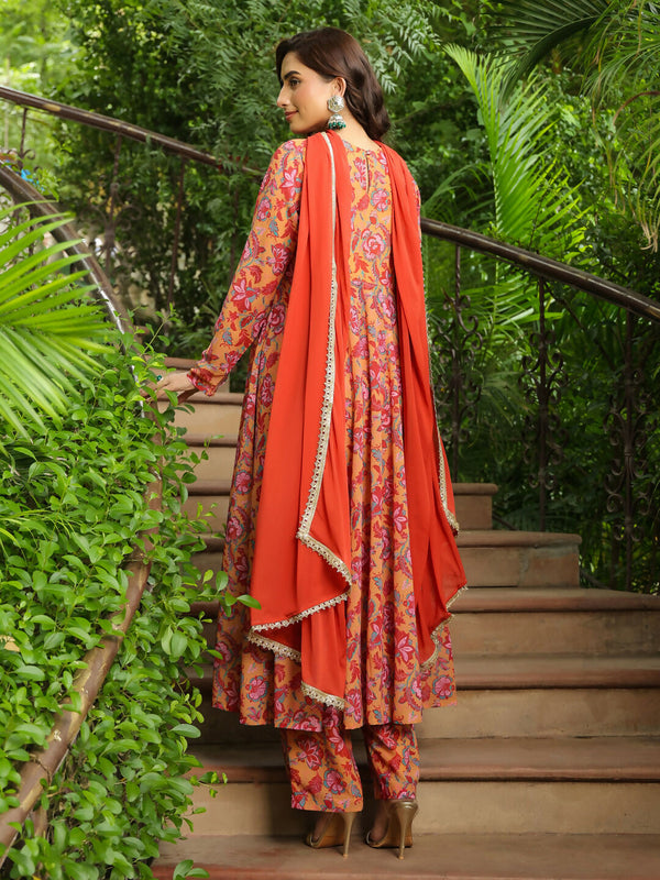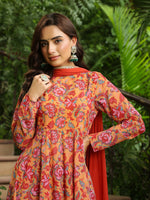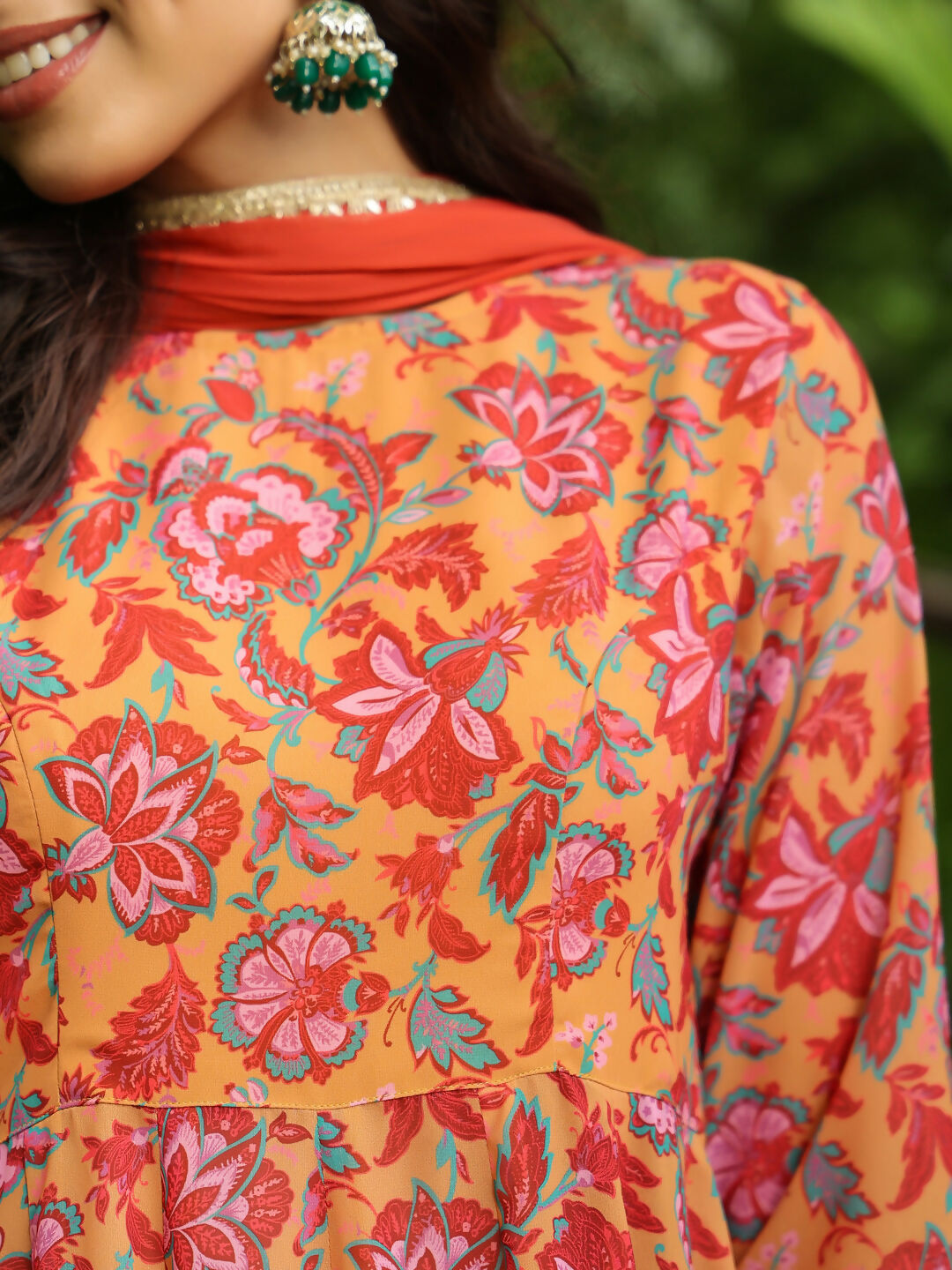 Janasya Mustard Georgette Floral Kurta,Bottom & Dupatta