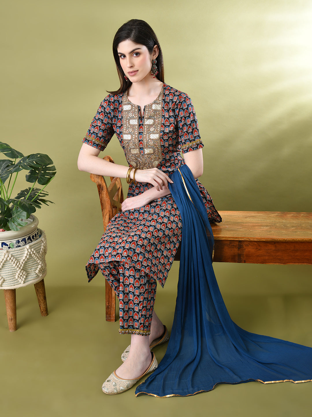 Myshka Women's Cotton Printed Kurta Set With Dupatta