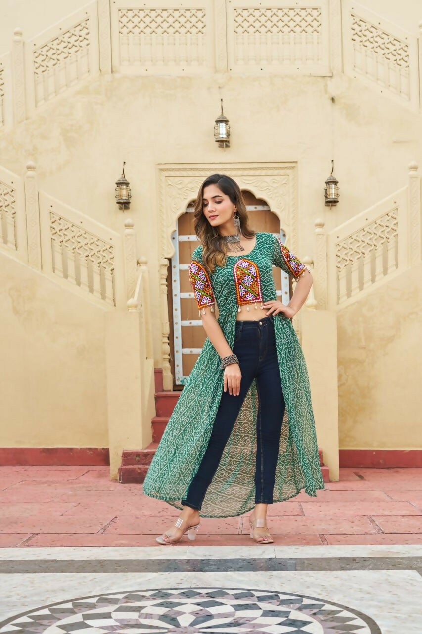 Vastranavya Green Navratri Special Kutchi Patch Work with Bandhani Printed Faux Georgette Kurti