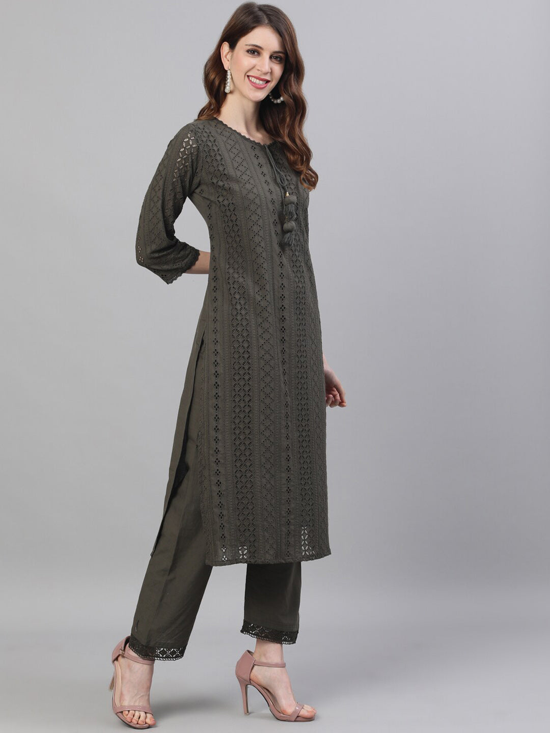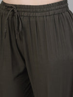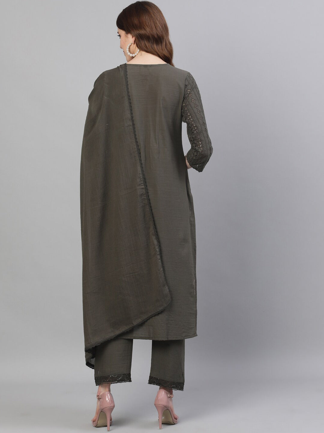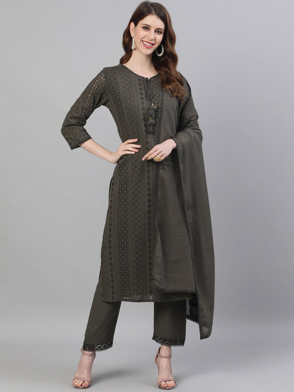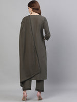 Ishin Women Olive Green Self Design Kurta with Trousers & Dupatta - S