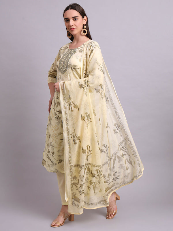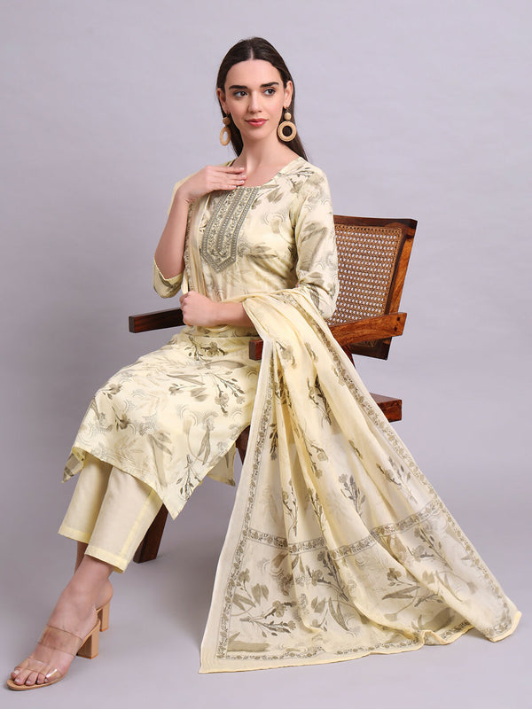 Joban Fashion Beige Cotton Floral Printed & Embroidery Work Kurta With Trousers & Dupatta Set - S
