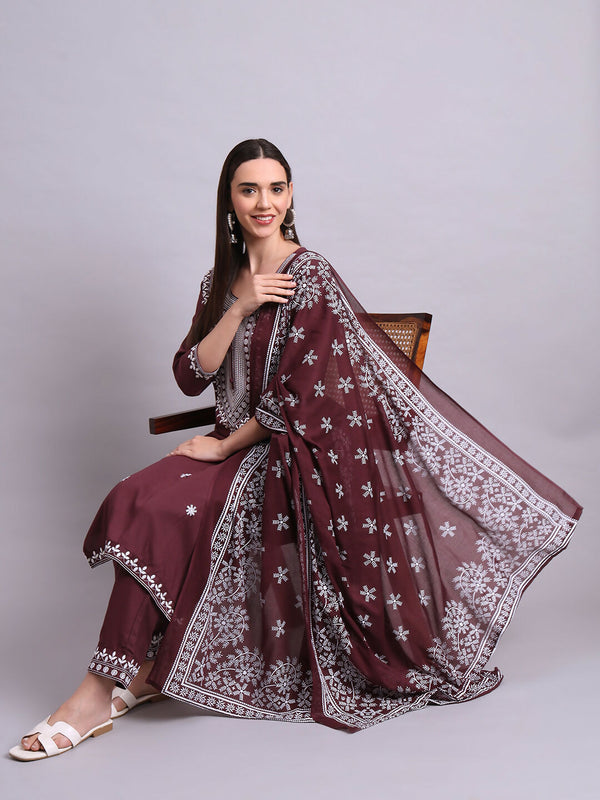 Joban Fashion Brown Cotton & Embroidery Work Kurta With Trousers & Dupatta Set