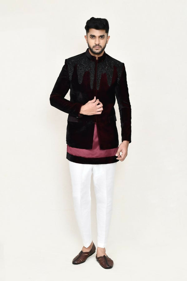 Joban Fashion Maroon Colored Satin Silk Fabric Open Prince Coat, Kurta With Straight Fit Pant