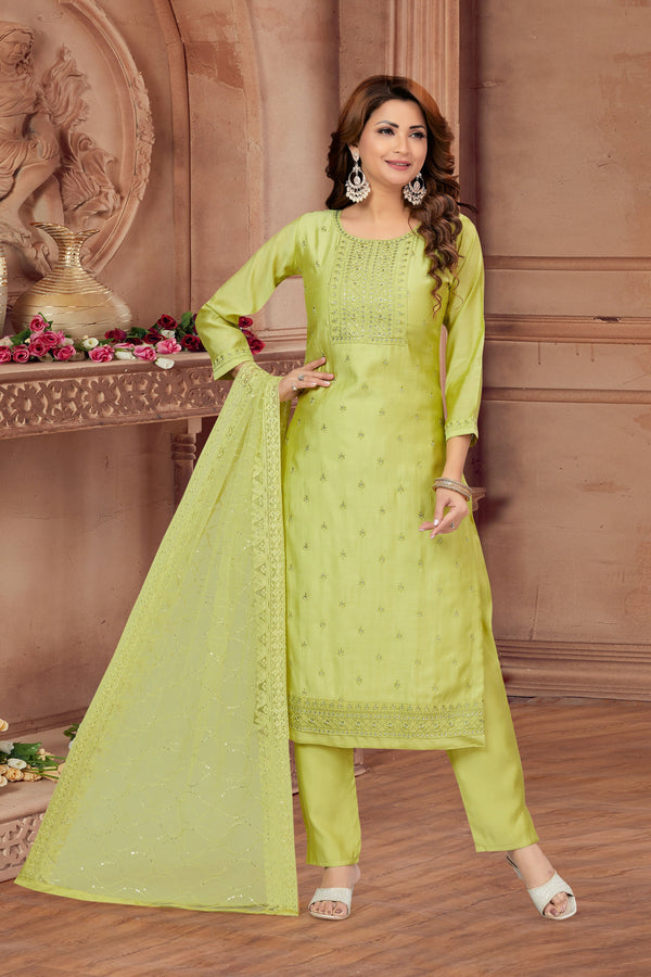 Joban Fashion Pista Soft Silk Resham Embroidery Work Kurta SetAbout the Product: Fabric Top:Soft Silk Top Color:Pista Legal Disclaimer: Product c... Read More...