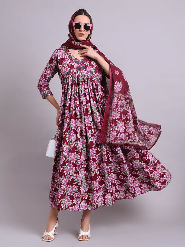 Joban Fashion Purple Cotton Floral Printed & Embroidery Work Anarkali Dress With Dupatta Set