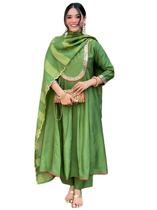 InWeave White Long Anarkali Rama Green Dupatta Set