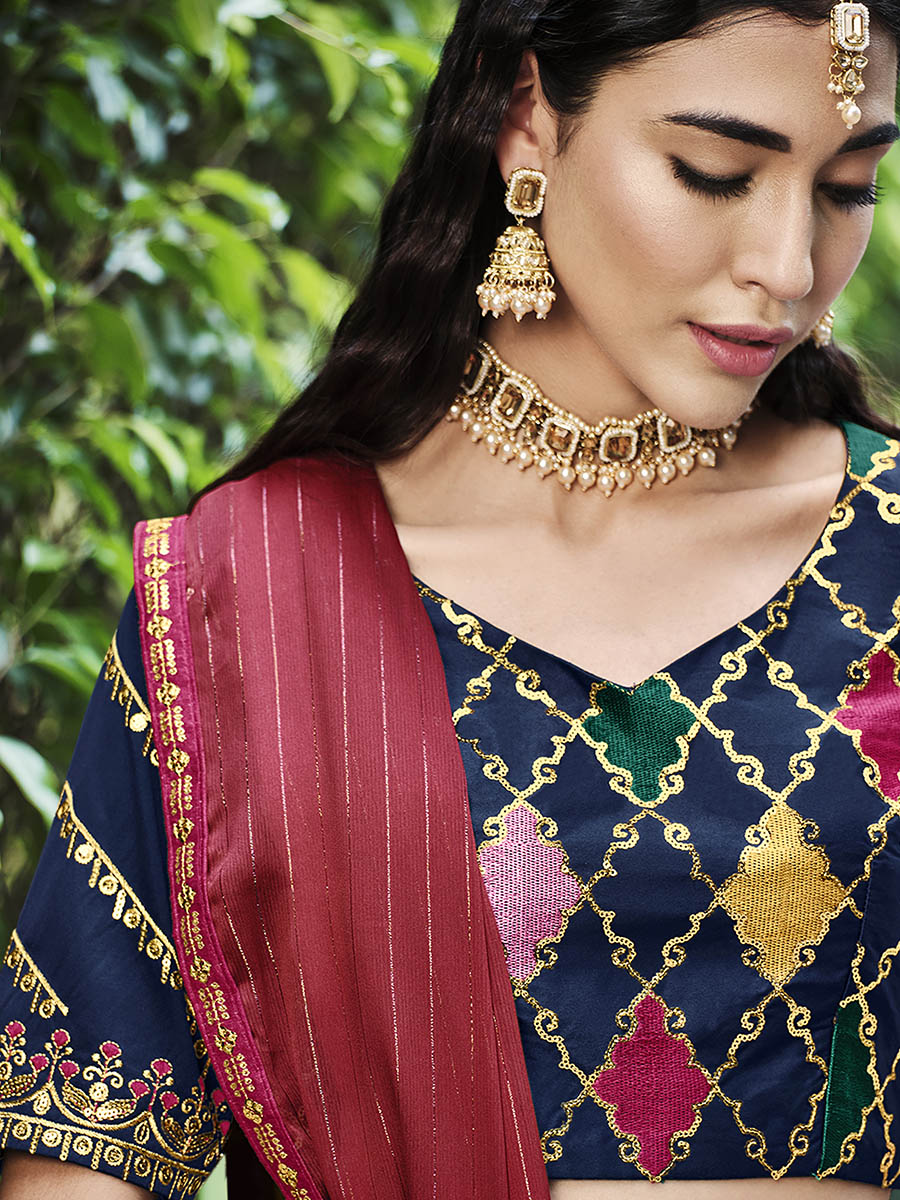 Navy Silk Embroidered Designer Lehenga Choli features a Silk lehenga , Silk choli and Chinon dupatta. Embroidery is completed with Dori, Sequins and Mirror. This Style is made in India and checked by hand to ensure high quality.