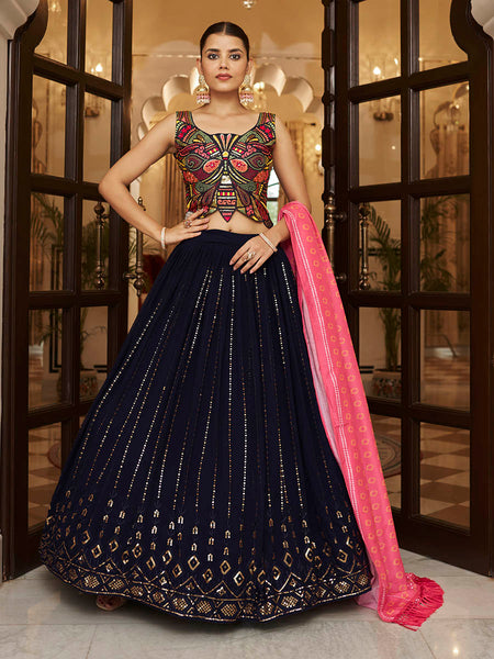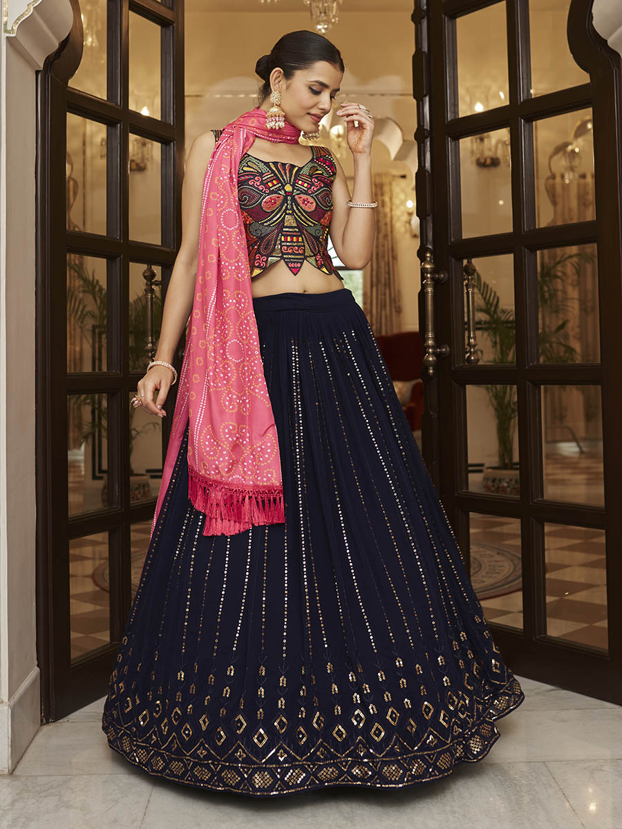 Myra Pink and Navy Blue Georgette Designer Lehenga Choli - Distacart