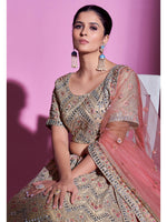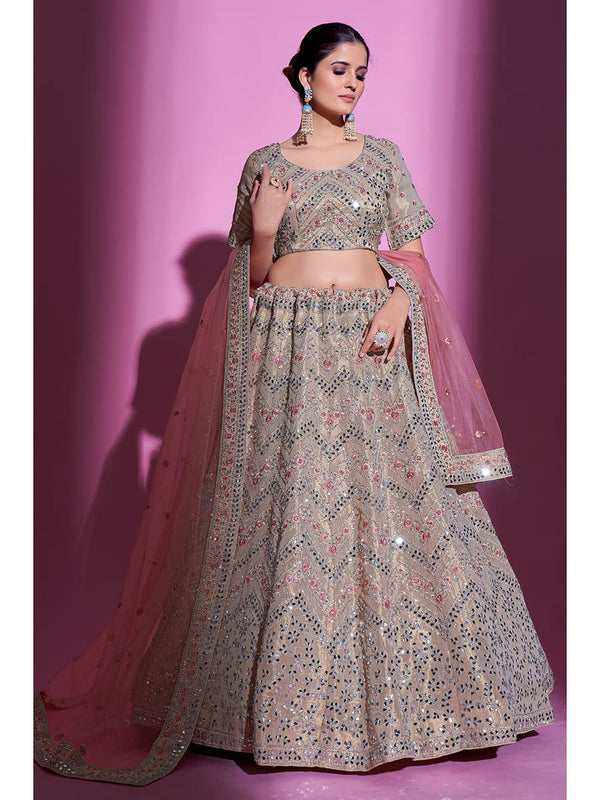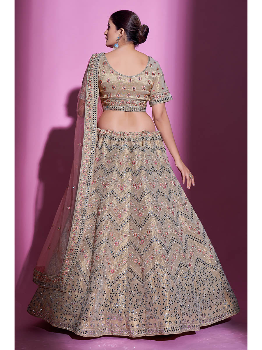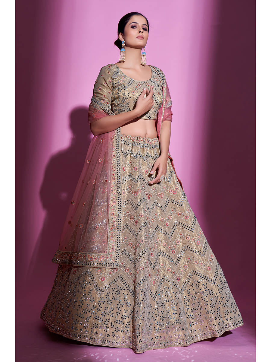 Tan Gota Silk Embroidered Designer Lehenga Choli features a Gota Silk lehenga , Gota Silk choli and Soft Net dupatta. Embroidery is completed with Sequins, Dori, Mirror & Thread. This Style is made in India and checked by hand to ensure high quality.