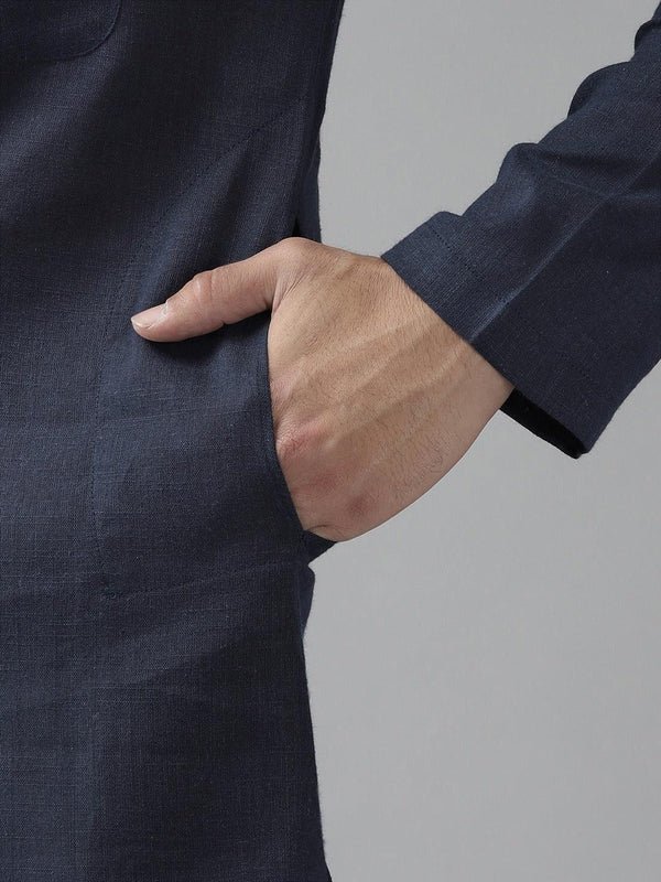 Men's Navy Blue Cotton Straight Kurta with Linen Effect Modern Collar & Full Sleeves