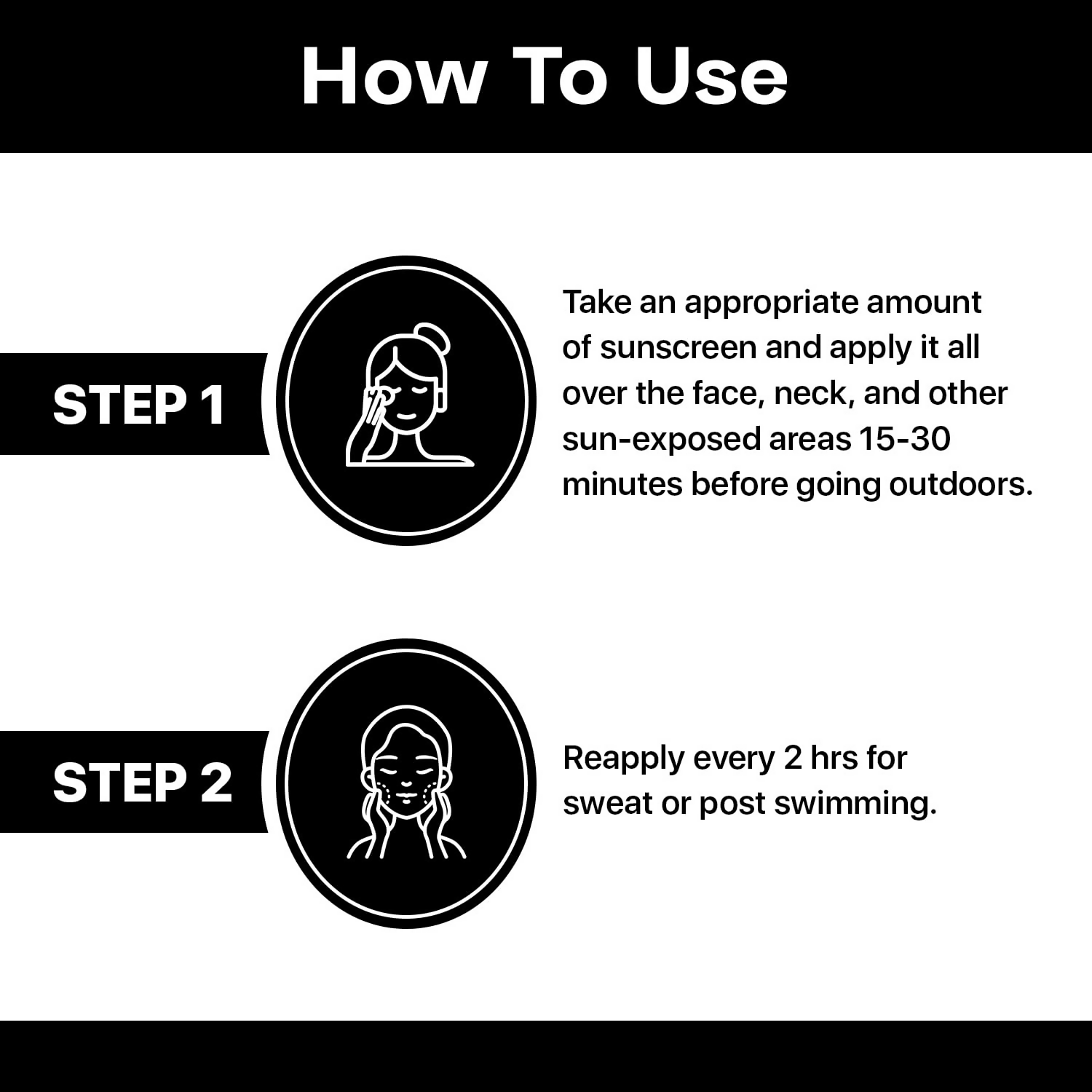 Take a generous amount of sunscreen and apply it to your clean face,neck and other areas exposed to the sun 15-30 minutes before stepping out in the sun.Use fingertips to massage onto your skin.Apply every 2 hrs during continuous sun esxposure.Re-apply after swim or in case of excessive sweating.