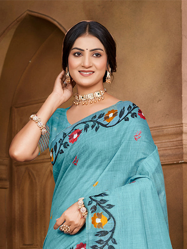 Sangam Prints Sky Blue Cotton Silk With Meena Woven Work Traditional Saree - Free Size