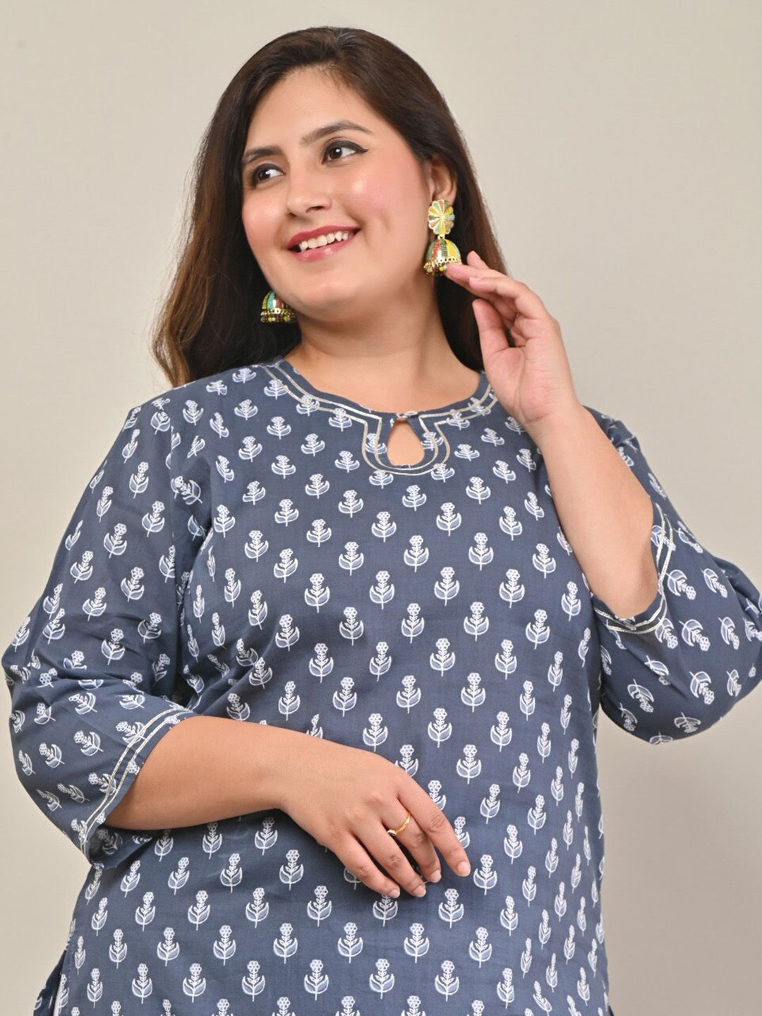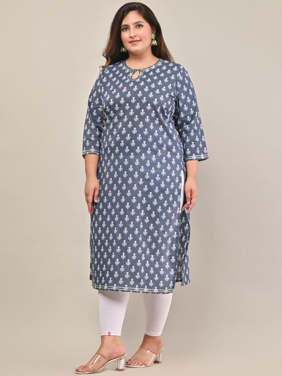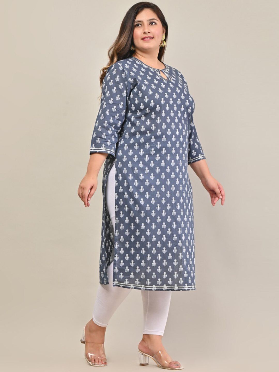 Swasti Plus size Floral Printed Keyhole Neck Cotton Kurta Product Details Colour: grey Floral printed Keyhole neck Long, regular sleev...