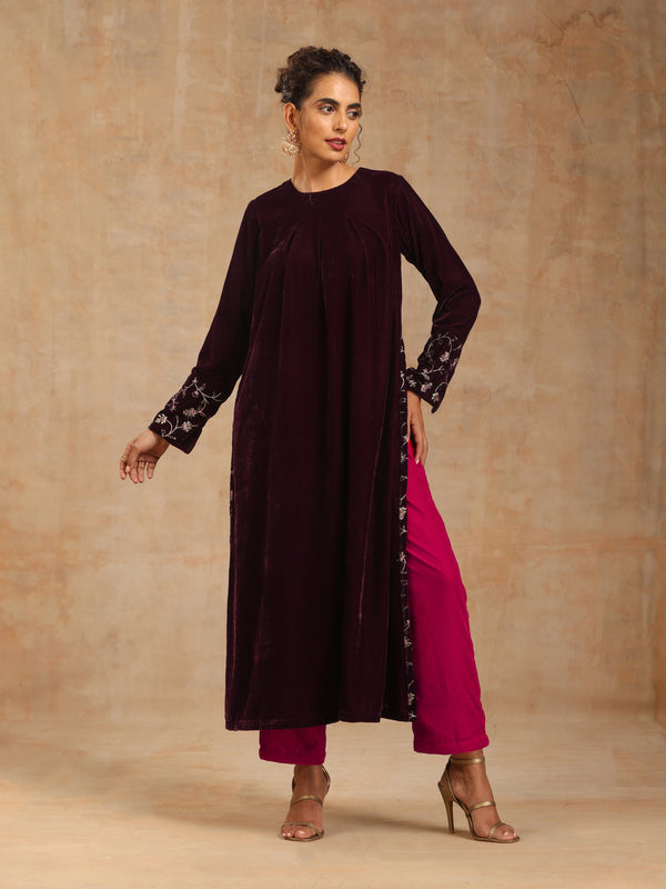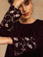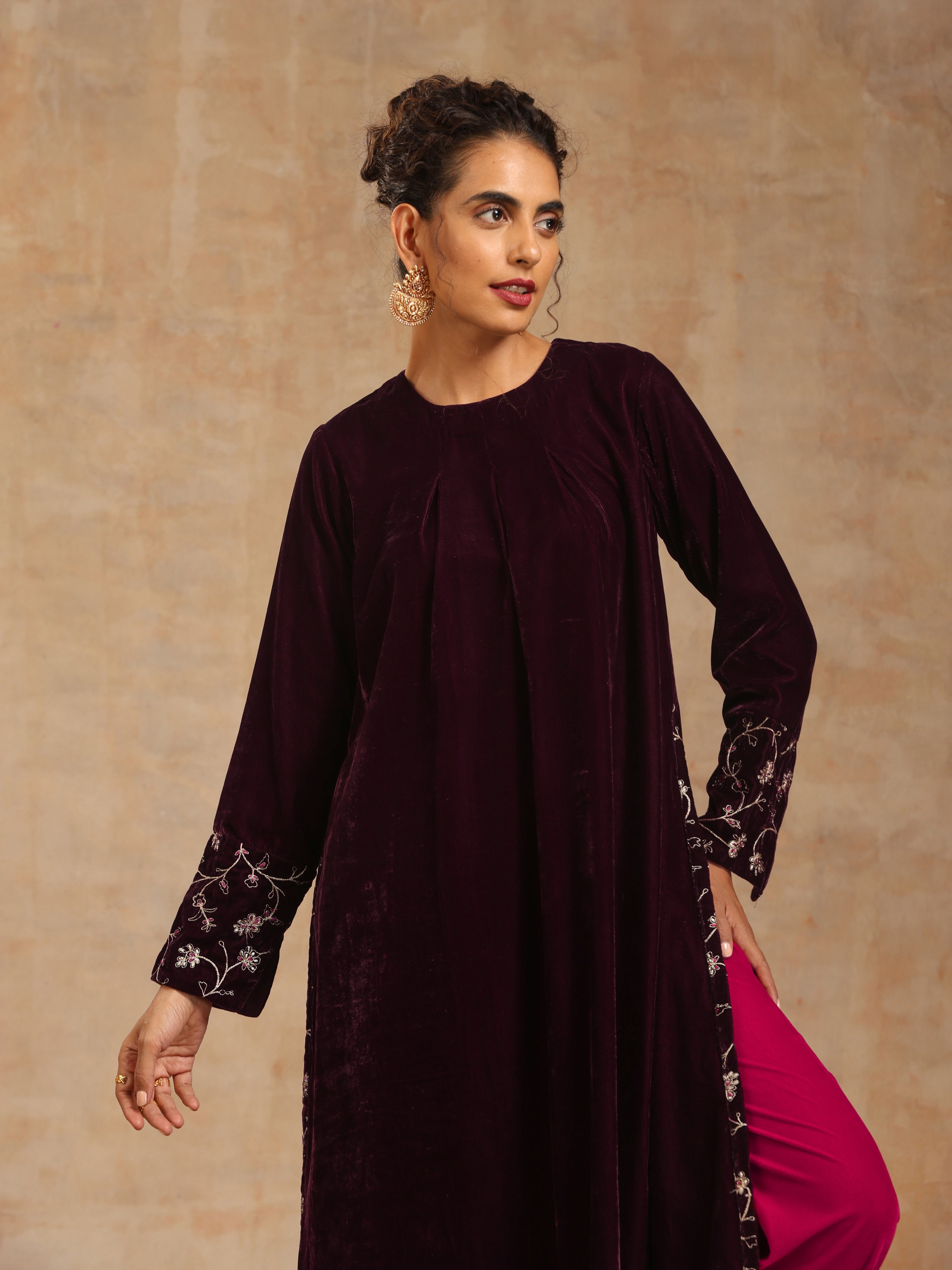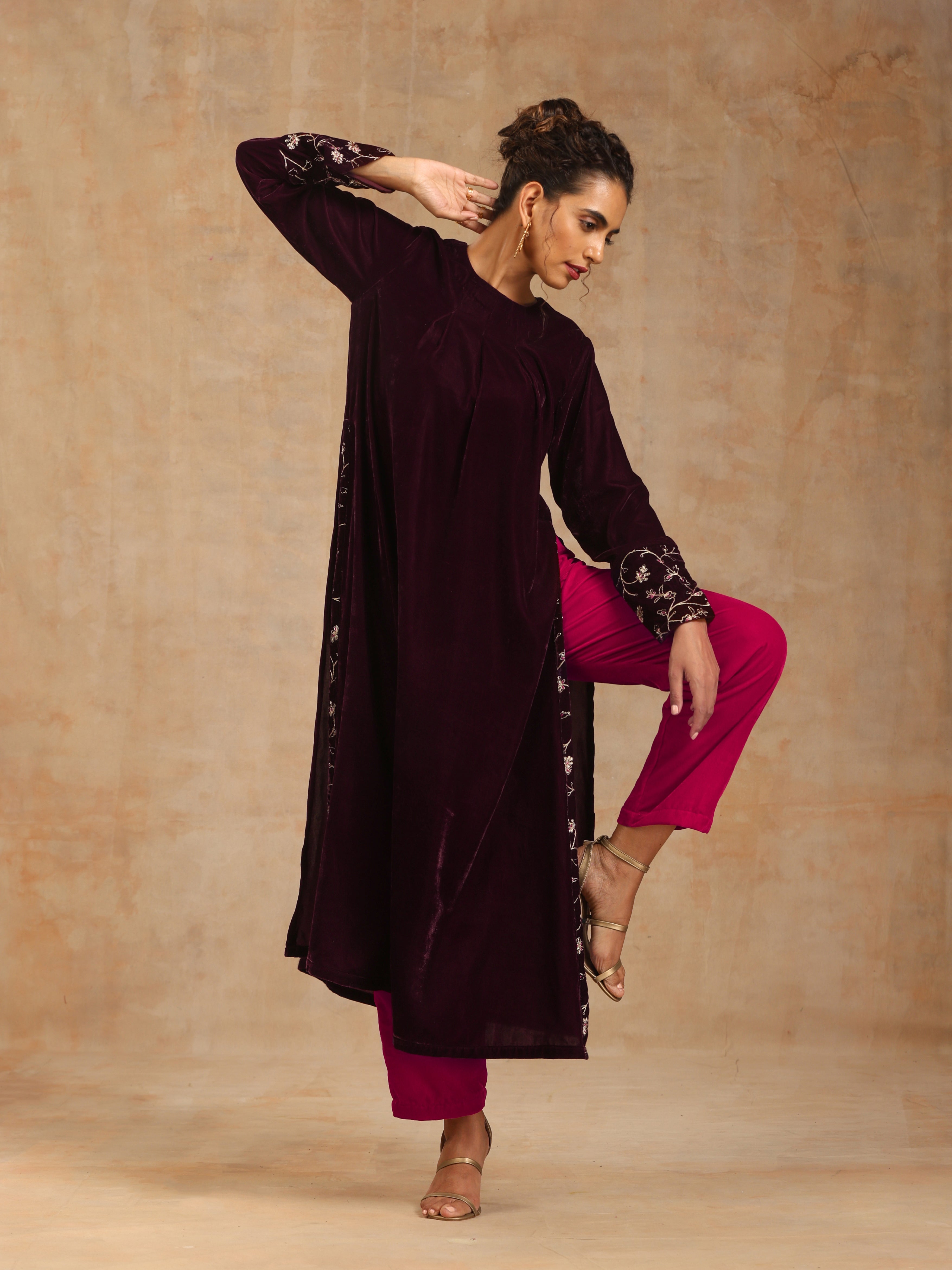 trueBrowns Wine Velvet Embroidered KurtaDescription Velvet Kurta with embroidered sleeve cuff and slit detail. It has full sleeves, Round Neck and ...