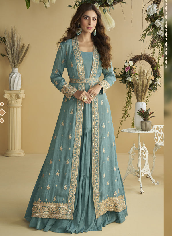 Vegaa Fashion Sky Blue Chinon Silk Embroidered Designer Gown With ShrugProduct Details:Wedding suit is the perfect choice for Indian festive or wed...