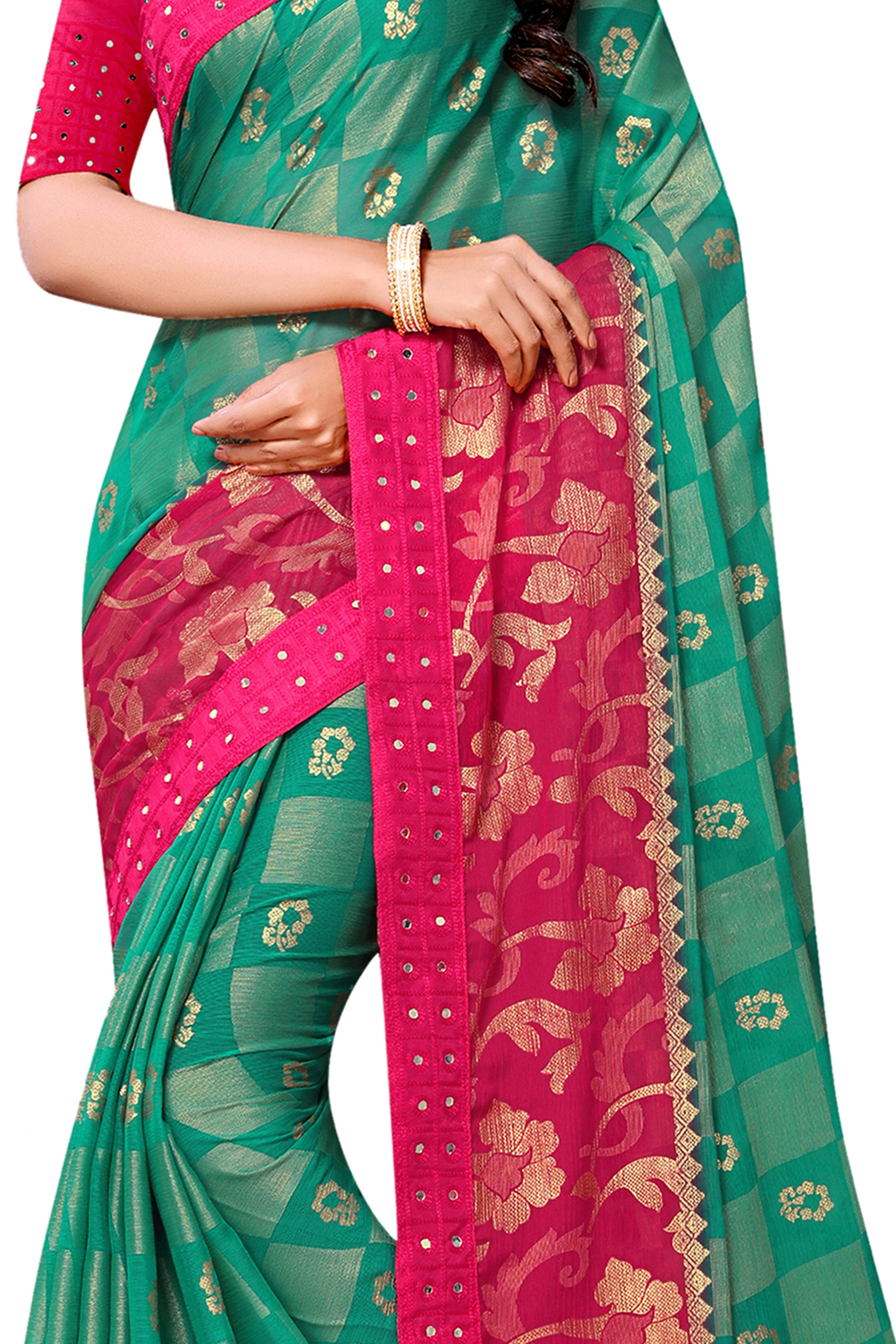 Vamika Rama & Pink Designer Chiffon Brasso Saree With Mirror Work LaceAbout the Product: Work: Mirror Work Base Fabric: Chiffon Brasso Fab...