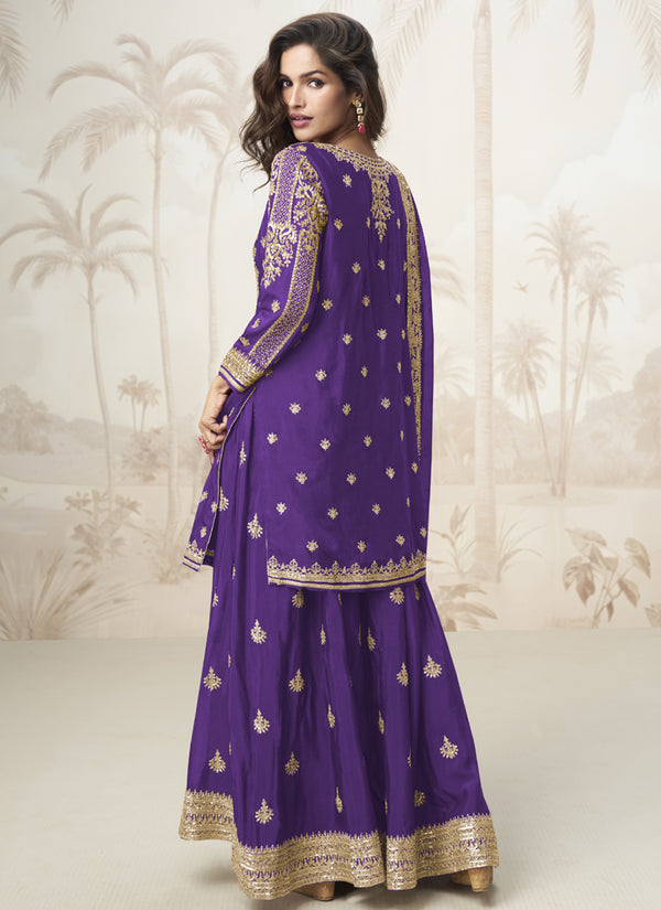 Vegaa Fashion Violet Chinon Silk Embroidered Sharara Suit