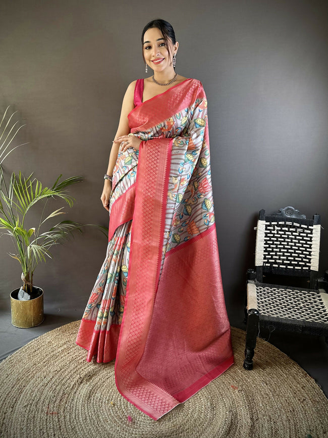 Joban Fashion Grey Floral & Ethnic Motifs Design Soft Silk Meenakari Banarasi Saree