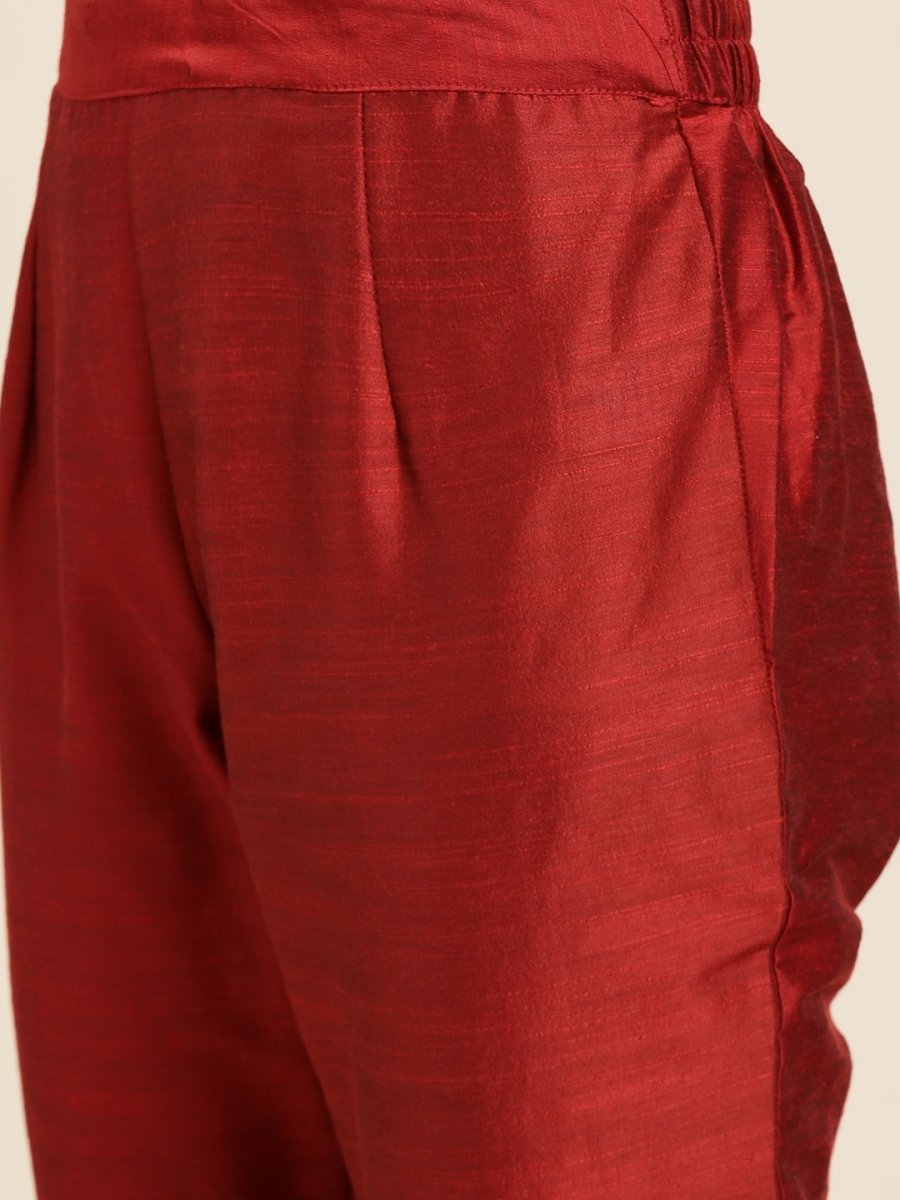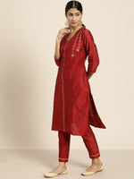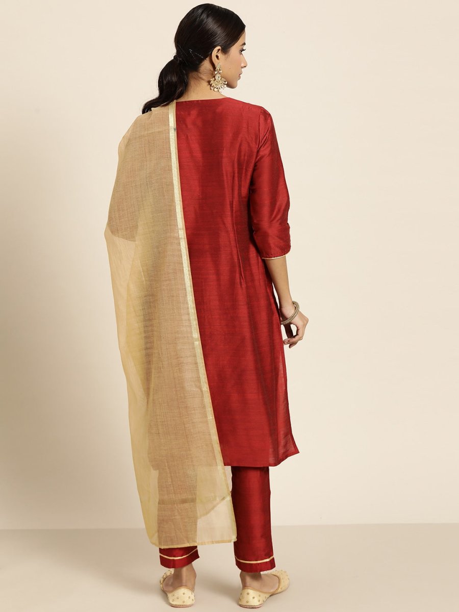 All About You Women Maroon & Golden Embroidered Regular Kurta with Trousers & Dupatta - XS