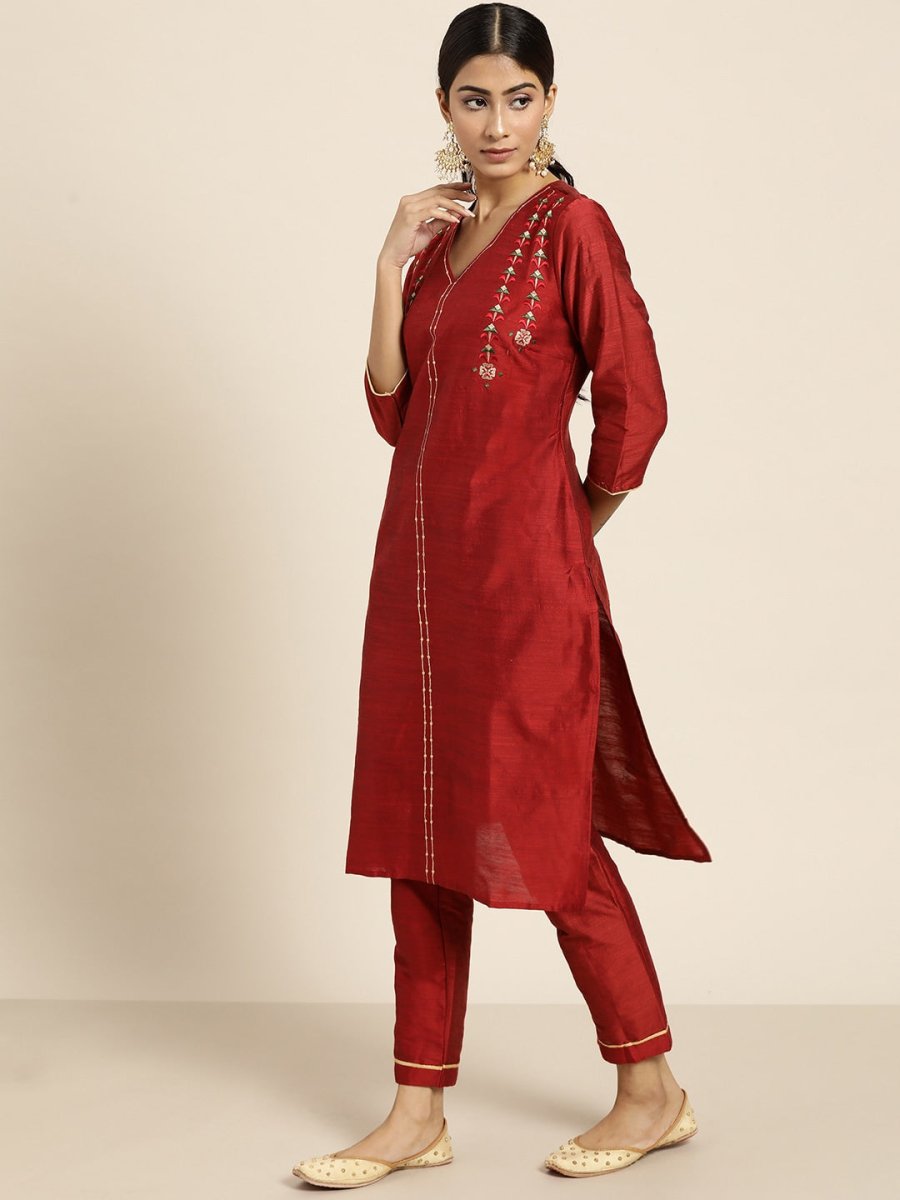 All About You Women Maroon & Golden Embroidered Regular Kurta with Trousers & Dupatta Product Details Maroon, golden and beige embroider...
