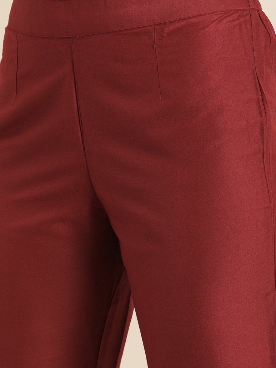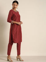 All About You Women Maroon & Golden Satin Finish Kurta with Trousers & With Dupatta