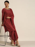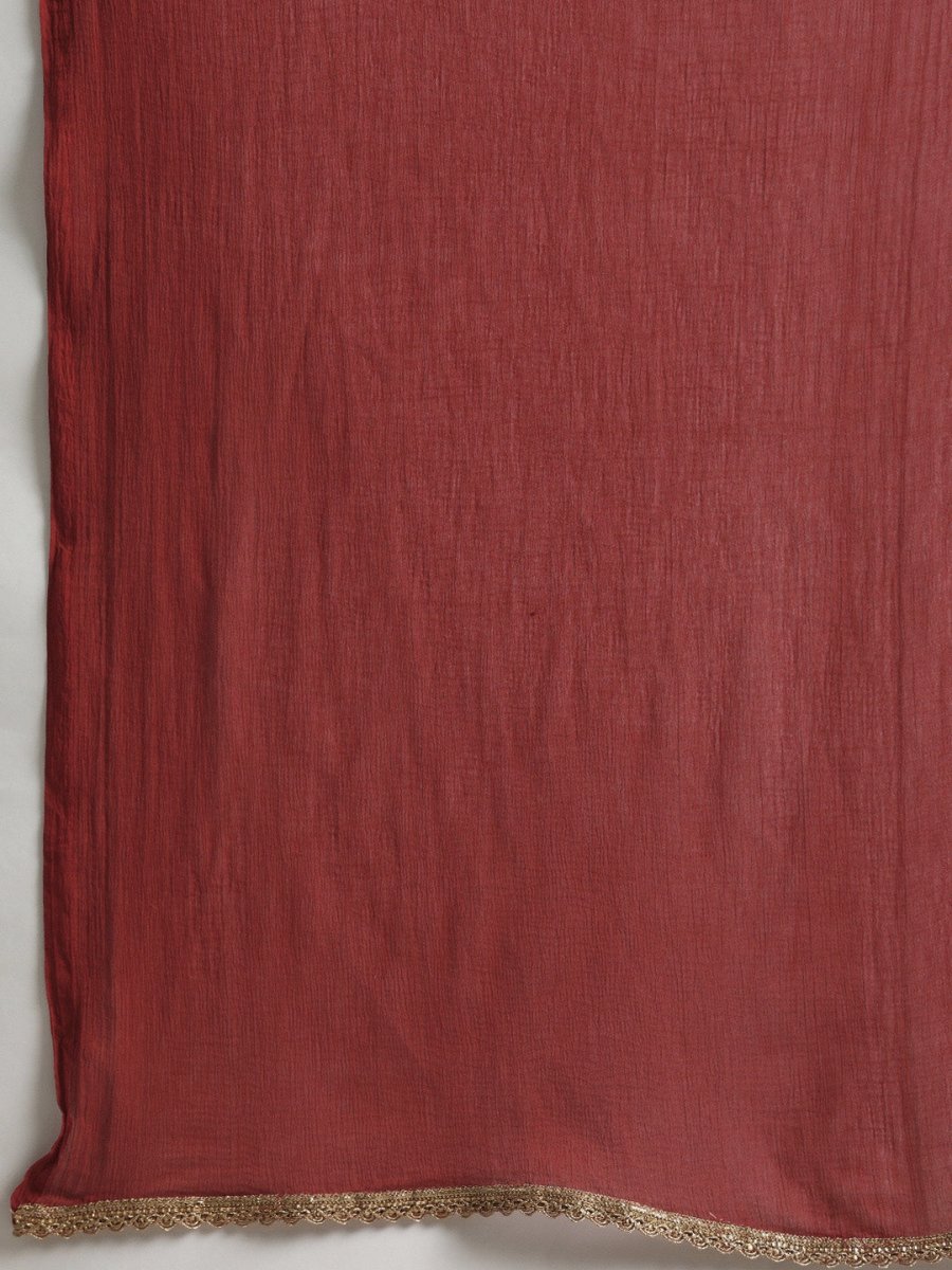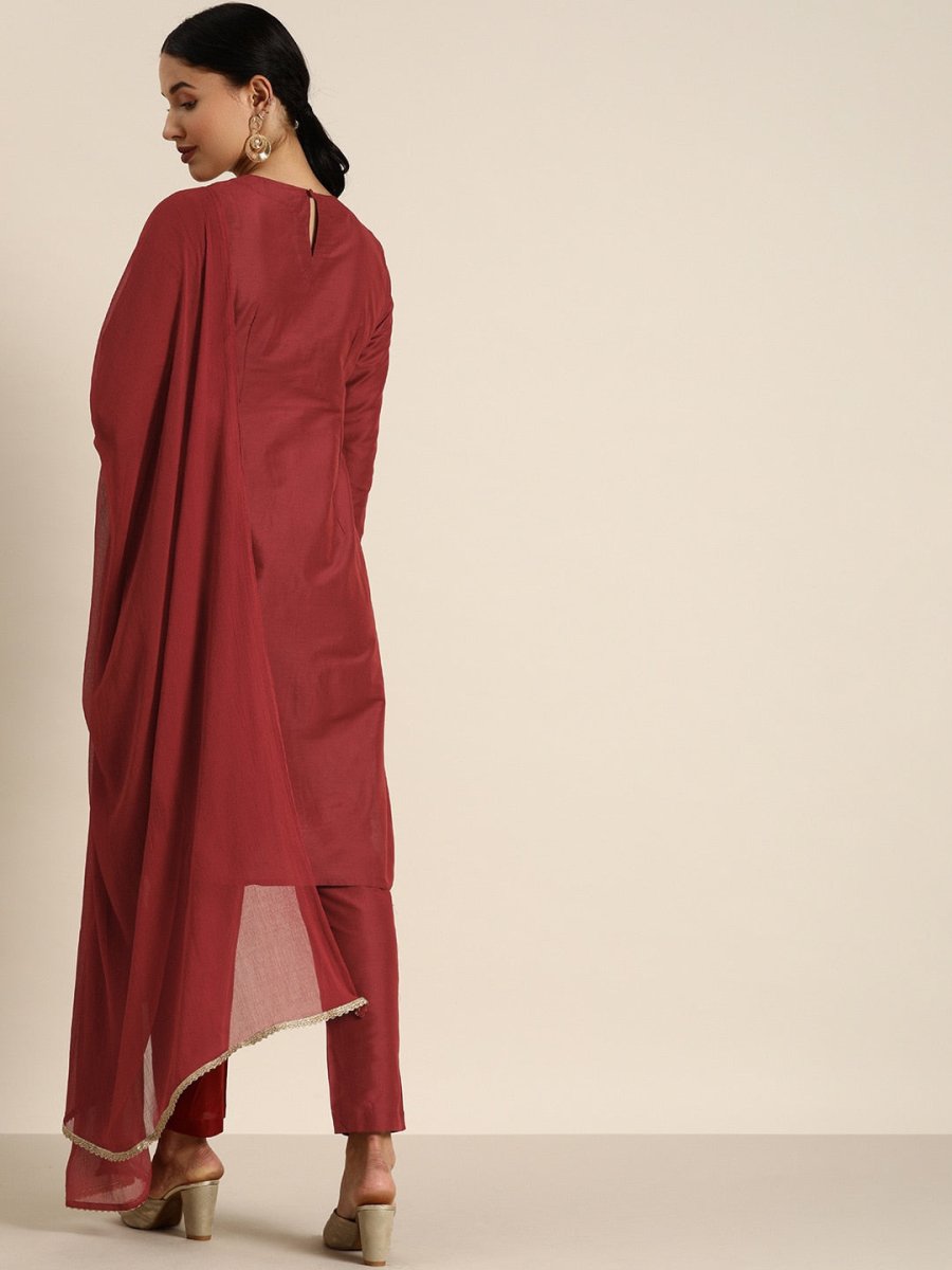 All About You Women Maroon & Golden Satin Finish Kurta with Trousers & With Dupatta - XS