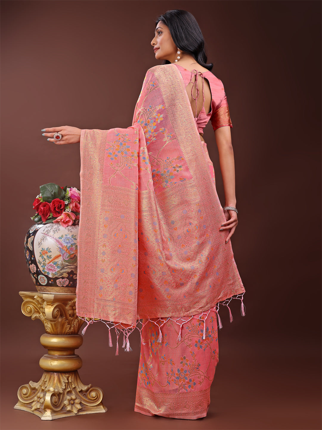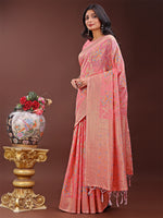 Astita Elegant Peach Linen Cotton Saree with Floral Weave & Soft Gold Pallu - Graceful Choice for Casual,Office & Festive Looks - Distacart