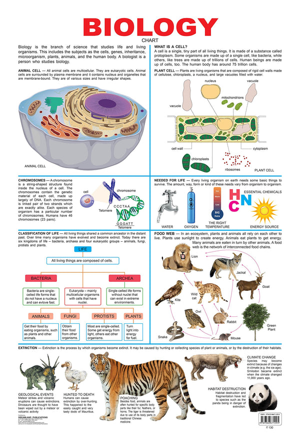 Biology” is a branch of science that deals with a living organism and its important processes. ‘Biology’ – this wall chart includes detailed images of plant cells, animal cells, classification of life, and more with all important information in an easy-to-read and simple-to-understand text.
