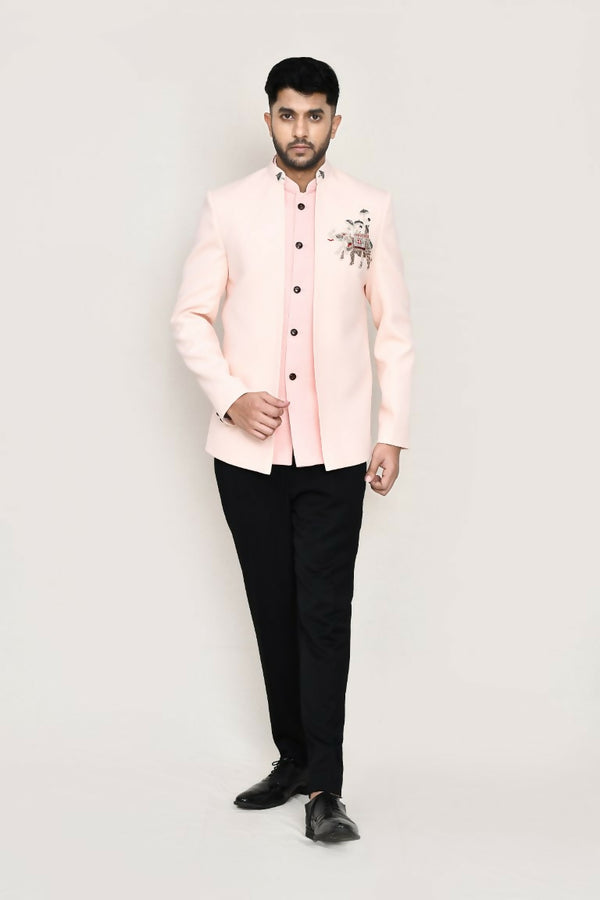 Joban Fashion Peach Colored Imported Polyester Fabric Open Prince Coat, Jacket With Pant
