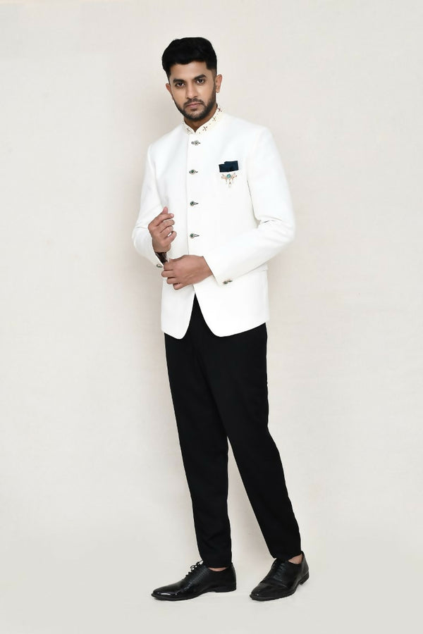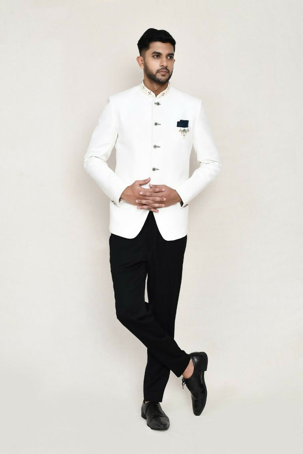 Joban Fashion White Colored Cotton Linen With Neck Embroidery Work Fabric Prince Coat, Pocket Square With Pant