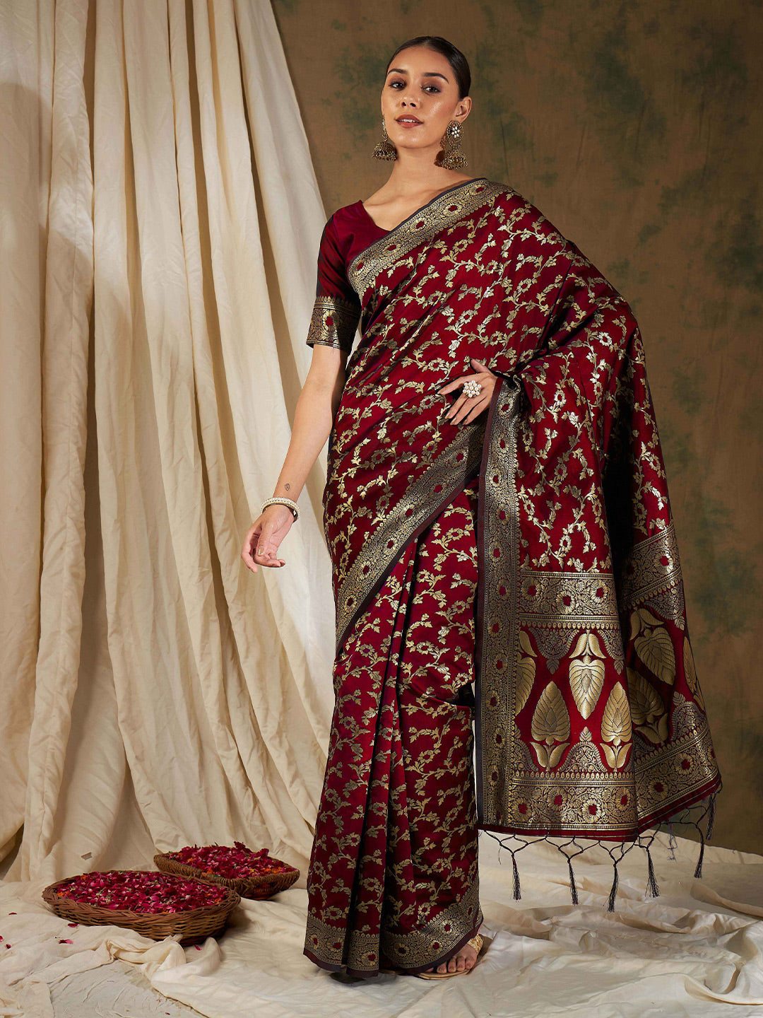 Sangria Woven Design Zari Kanjeevaram Saree Product Details Design Details Maroon and golden kanjeevaram saree Woven design saree with woven de...