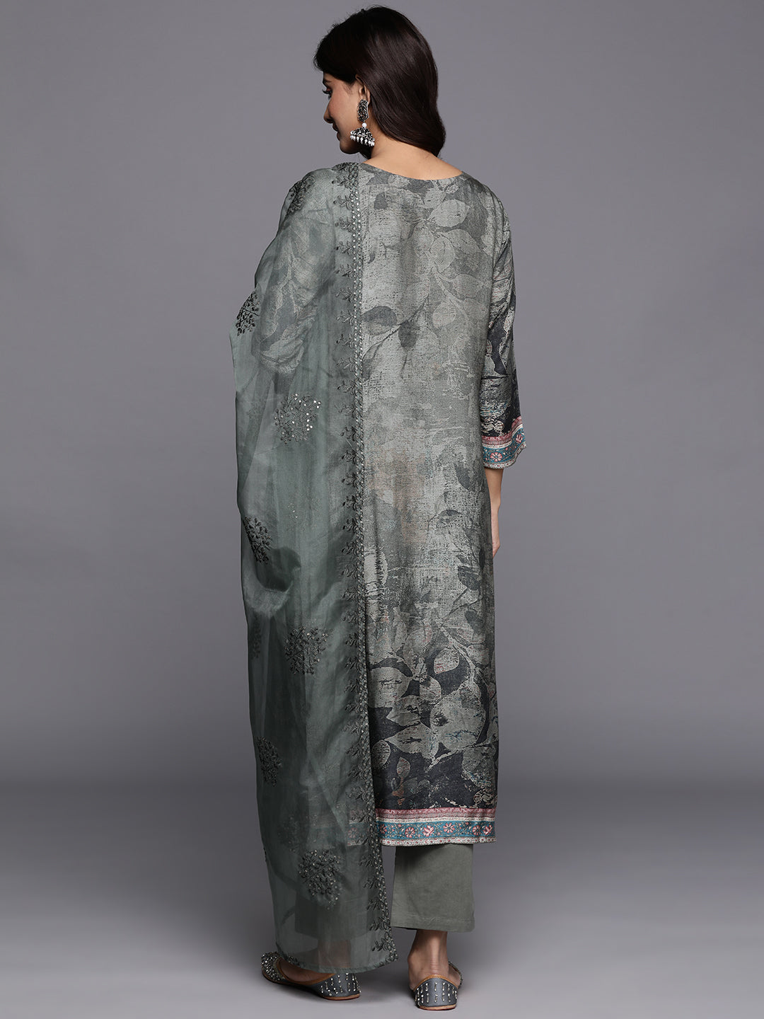 Green Floral Printed Round Neck With Embroidered Placket Three Quarter Sleeves Straight Kurta With Organza Embroidered Hem Paired With Tonal Solid Bottom And Embroidered Dupatta