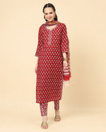 Varanga Women Red Viscose Rayon Printed Regular Kurta With Trousers & Dupatta - S