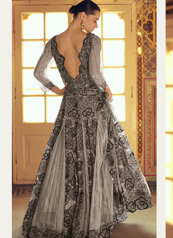 Vegaa Fashion Light Grey Viscose Shimmer Jacquard Silk Embroidered Gown