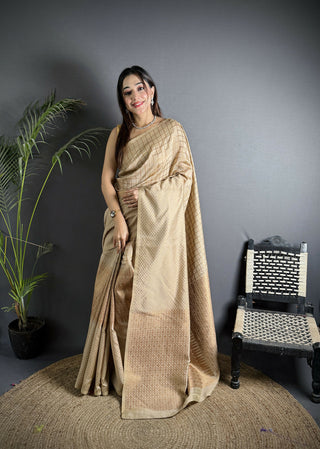 Joban Fashion Ivory Banarasi Soft Lichi Silk Checks & Woven Saree