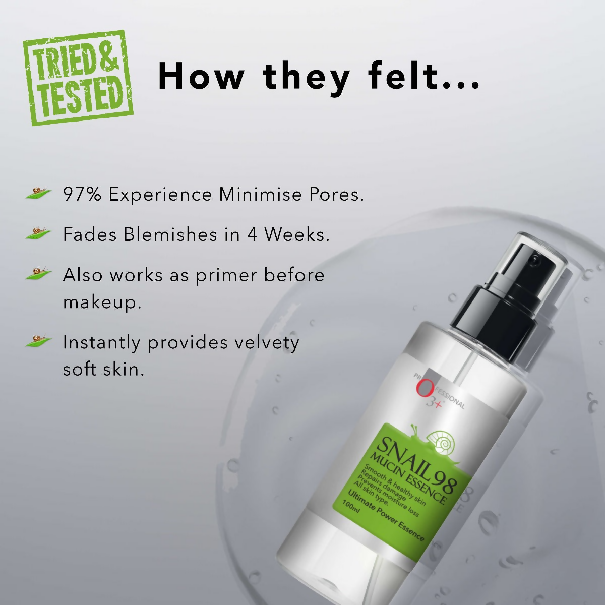• O3+ Snail 98 Mucin Essence comprises 98% skin-friendly snail secretion filtrate in a cloudy gelatinous texture that is effective at repairing damaged skin, shrinking pores, improving skin elasticity, and maintaining hydration levels all day long. It contains an ultimate pore-shrinking complex with essential ingredients, that nourish, repair and revitalise the skin. Snail mucin has the ability to repair everything from dry patches to acne breakouts while helping reduce hyperpigmentation, Glycolic acid helps in regenerating skin cells and Aloe leaf gives a soothing & calming effect so even the most sensitive skin can use it.