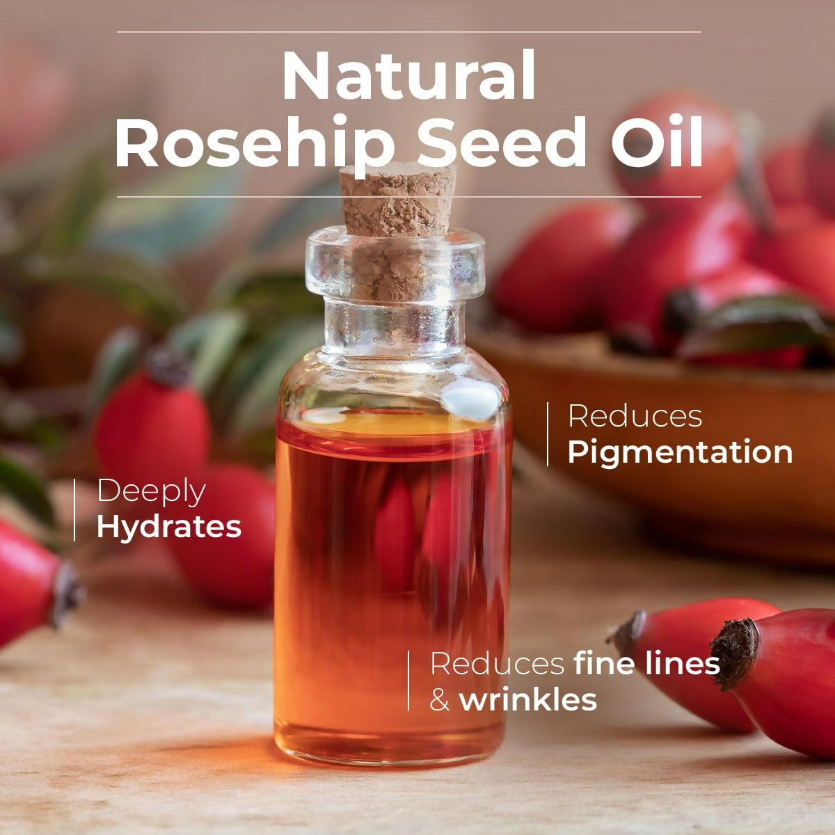 • Natural Caffeine, Rosehip Oil, Hyaluronic Acid