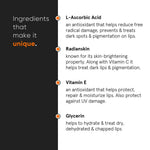 • Made with a biologically active & natural form of vitamin c, L-Ascorbic Acid helps in dealing with hyperpigmentation and minimising signs of ageing on lips as an effective antioxidant.